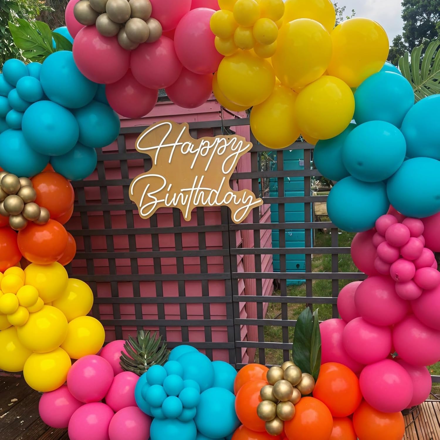 - ăPremium QualityăCrafted from long-lasting and thick latex material, these tropical balloons are safe, and easy to inflate with air or helium. The included monstera and palm leaves add a realistic tropical touch, creating a rich, natural vibe. The metallic gold accent elevates the entire setup, making your party photo-ready.