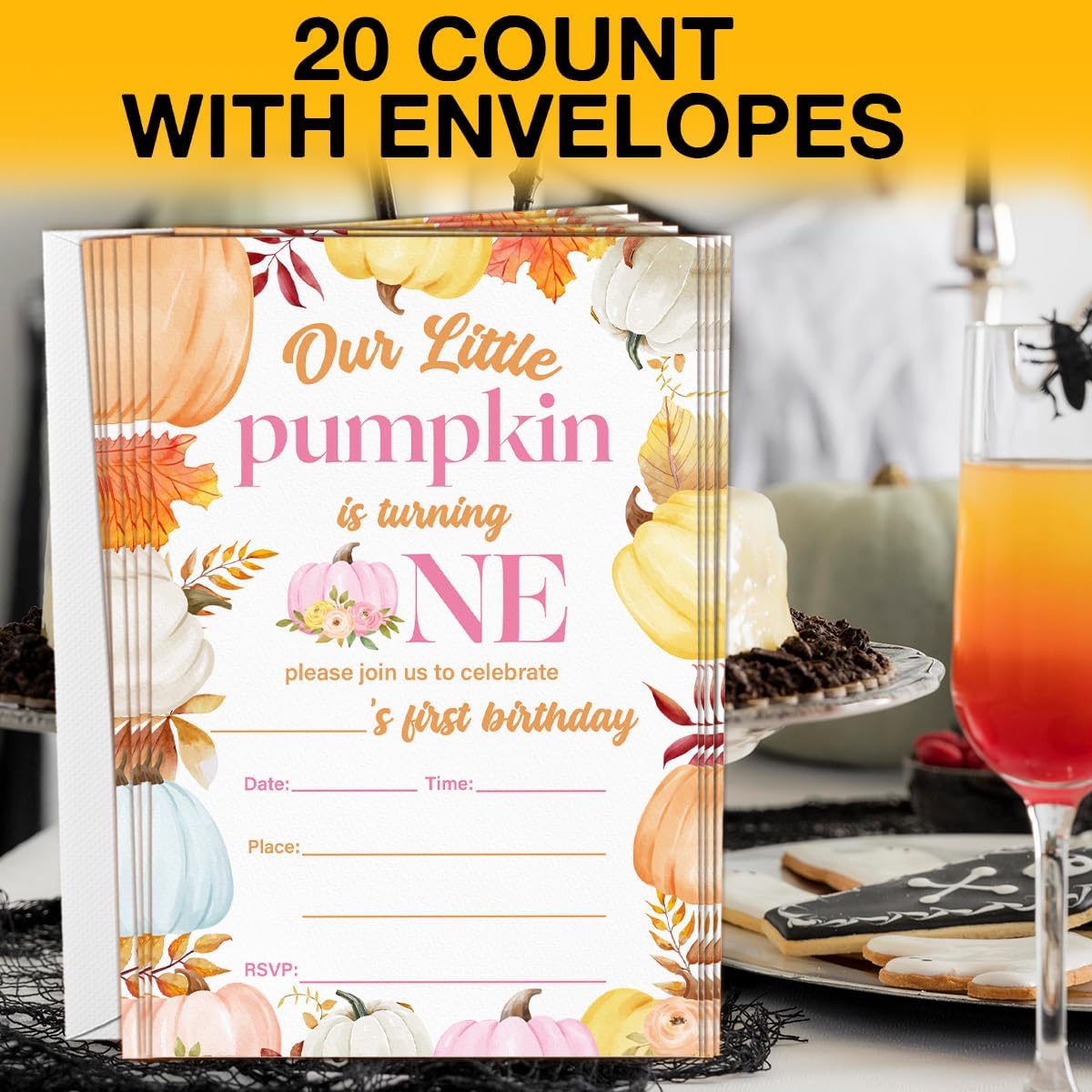 Pumpkins First Birthday Party Invitations for Baby Girl Little Pumpkin 1st Birthday Party Fill in Invites Cards With Envelopes (20 Count), Double Sided Design