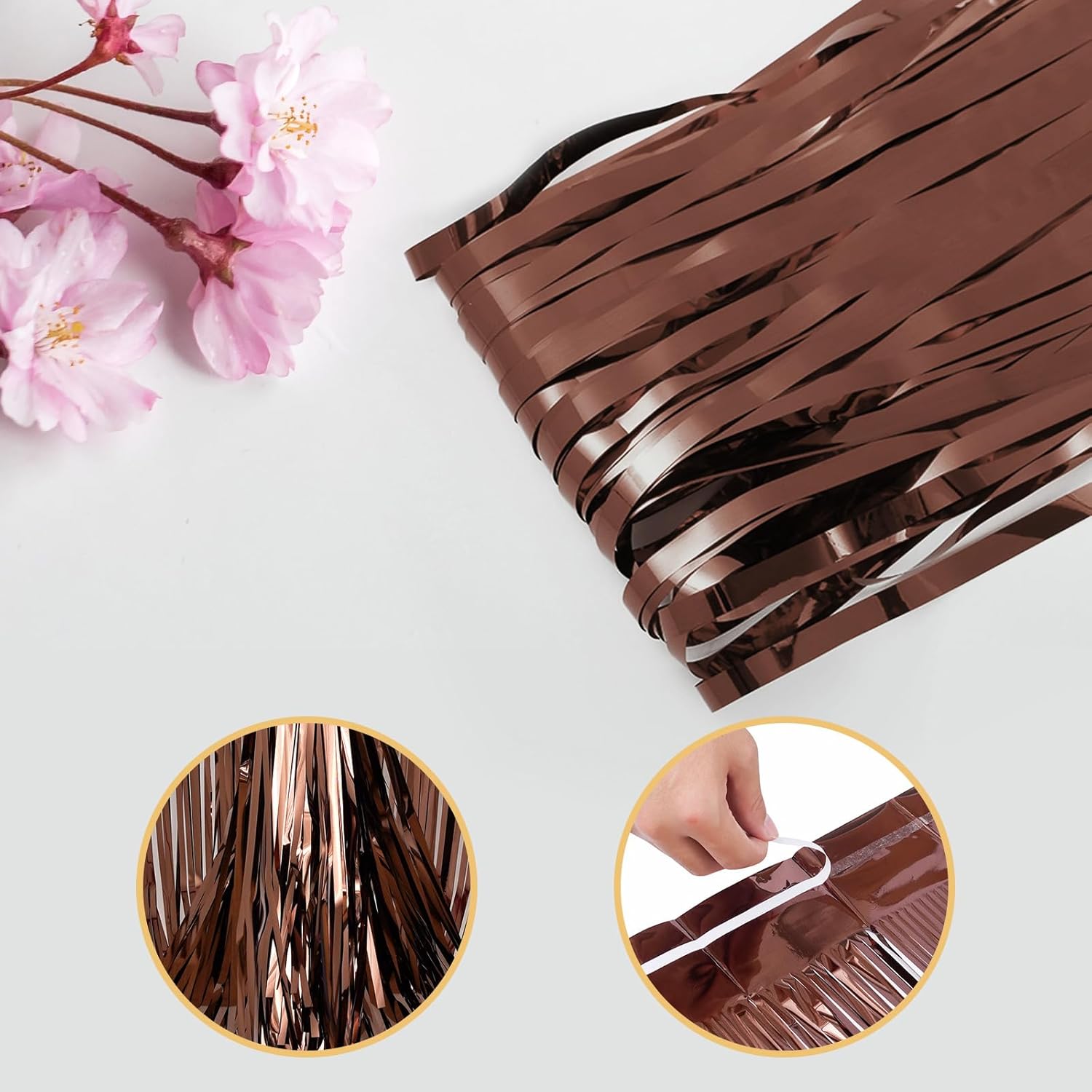 - {Easy to Use}: Easily tear off the double-sided tape on the top and back of the tinsel curtain, and then stick this tassel curtain on the wall, window, table, door or any place you like to brighten up the party. Hang each individual golden tassel curtain in a different position or double layer to get a more perfect effect.