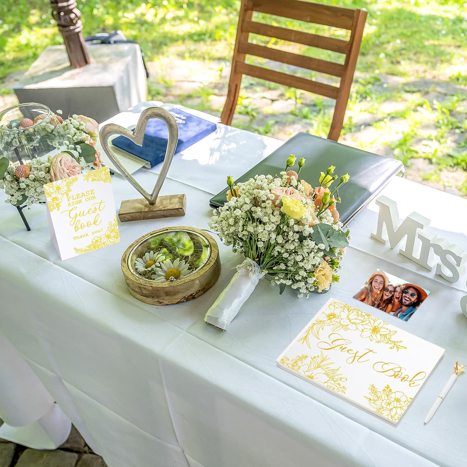 - Complete Set for Party: you will receive a 7x9 inch wedding guestbook, a wedding table sign, a sparkling diamond pen, and 4 sheets of photo stickers; This set provides most things you need to capture snapshots and sincere notes, making your celebration seamless and unforgettable