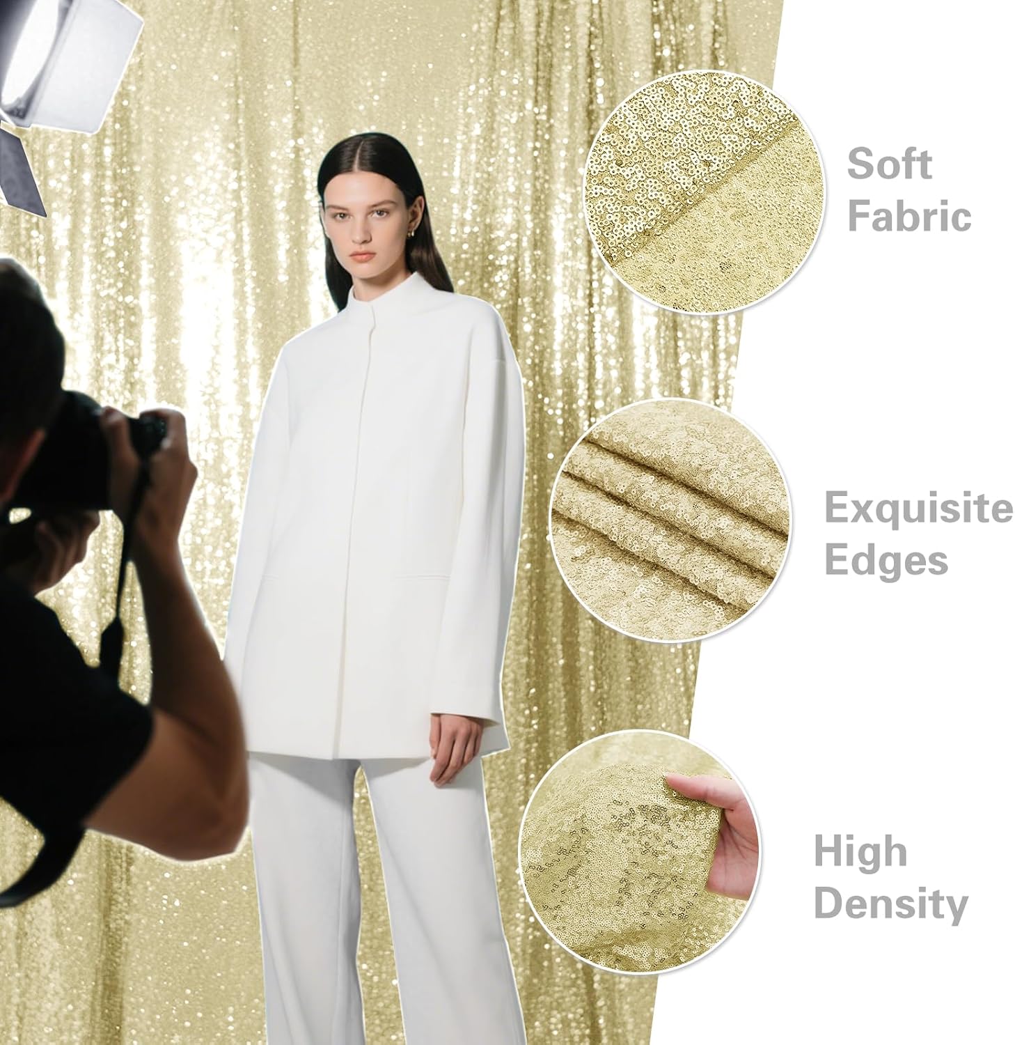 - Durable Material: The sequin backdrop is made of 3MM round density sequins with mesh fabric backing. All sides are well folded and sequins are not easy to drop which can be reused.