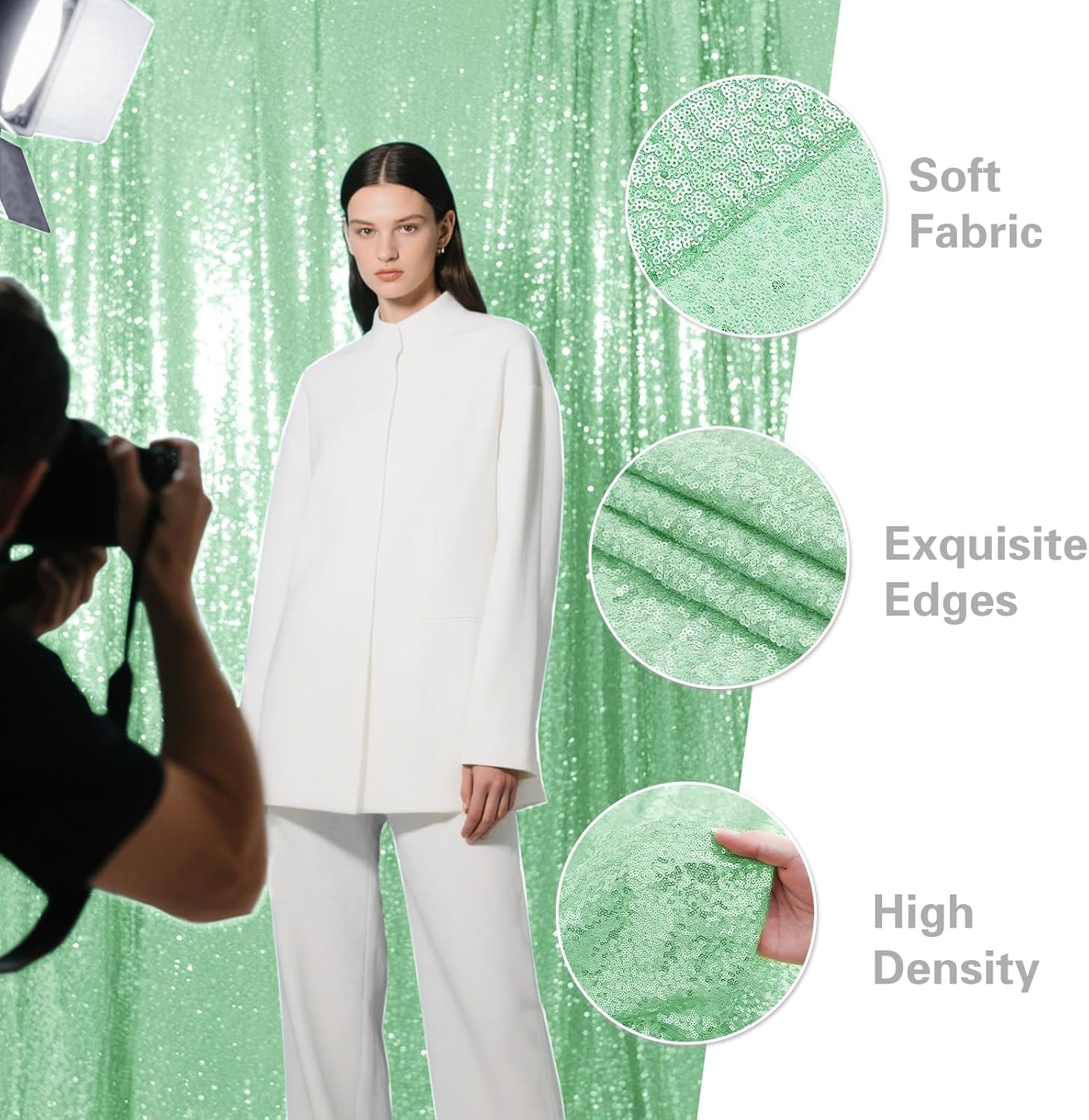 - Durable Material: The sequin backdrop is made of 3MM round density sequins with mesh fabric backing. All sides are well folded and sequins are not easy to drop which can be reused.