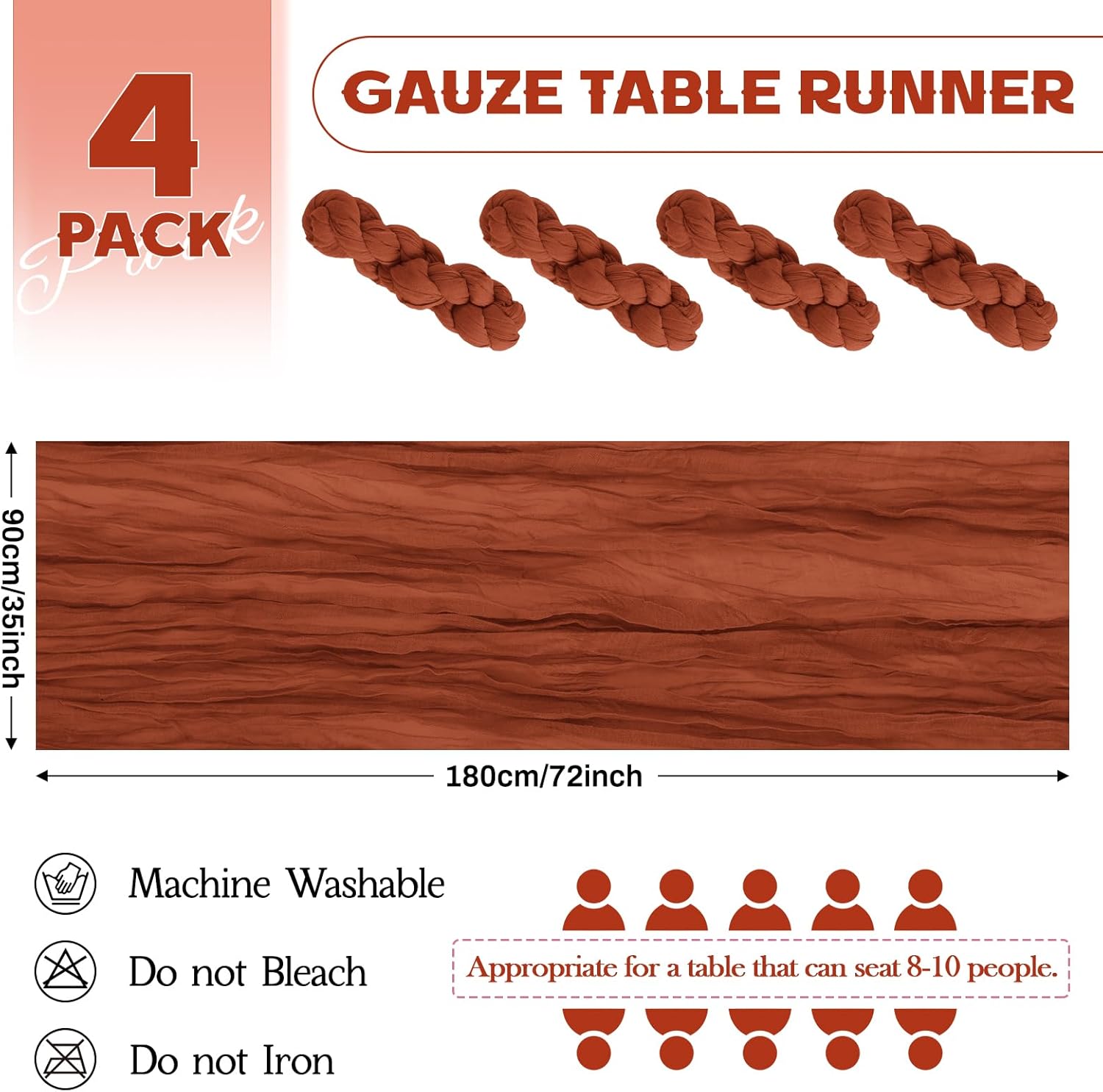 - 【 Package Included】 You will receive 4 piece terracotta cheesecloth table runners, the quantity is sufficient for your daily use and replacement needs. Cheese cloth table runner measure 35 inches wide and 72 inches long, it's long enough to fit different size tables and chairs. These table runners are skin-friendly as they are environmentally friendly. Aktor store has many different colors for you to choose. Perfect for romantic and elegant party events.