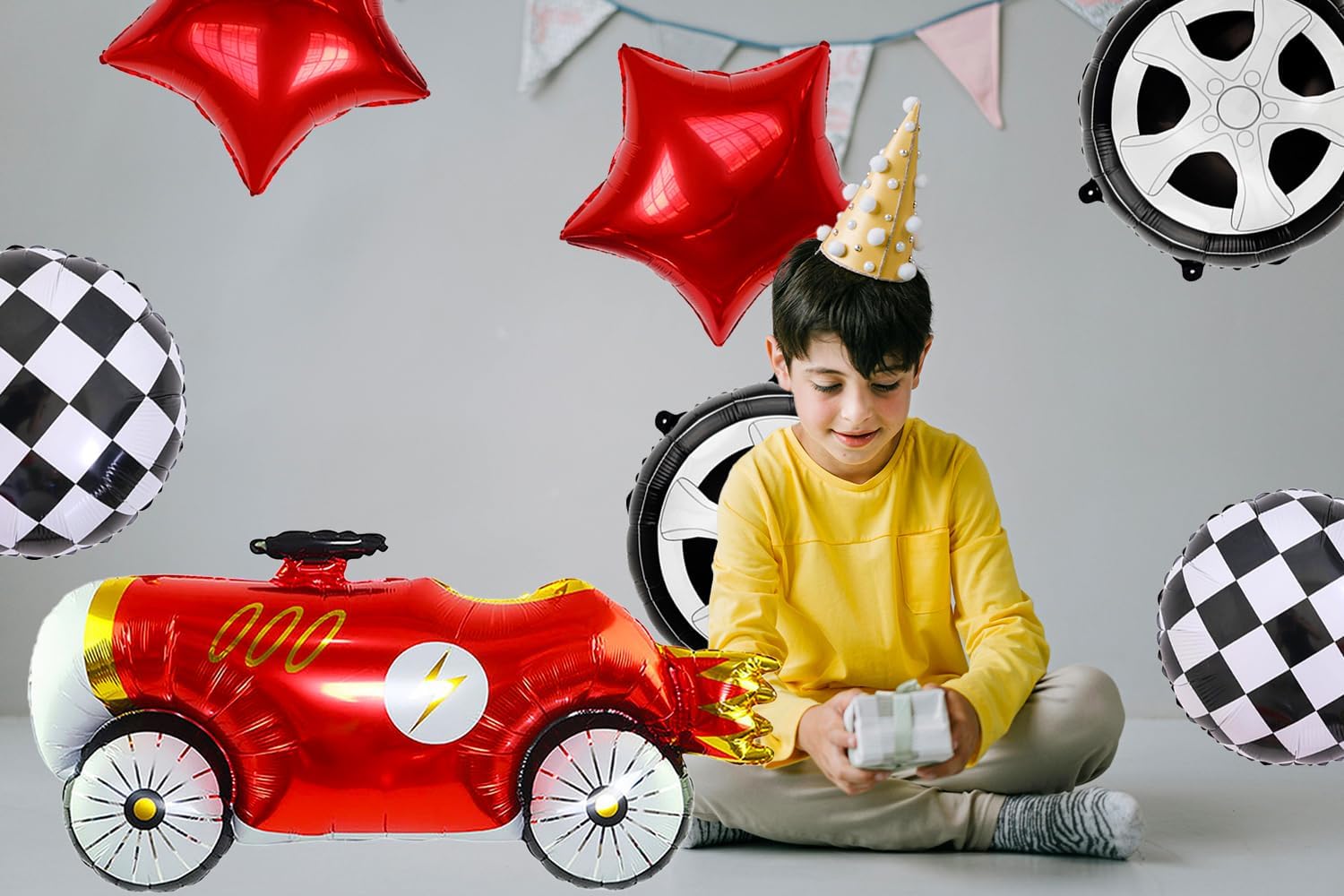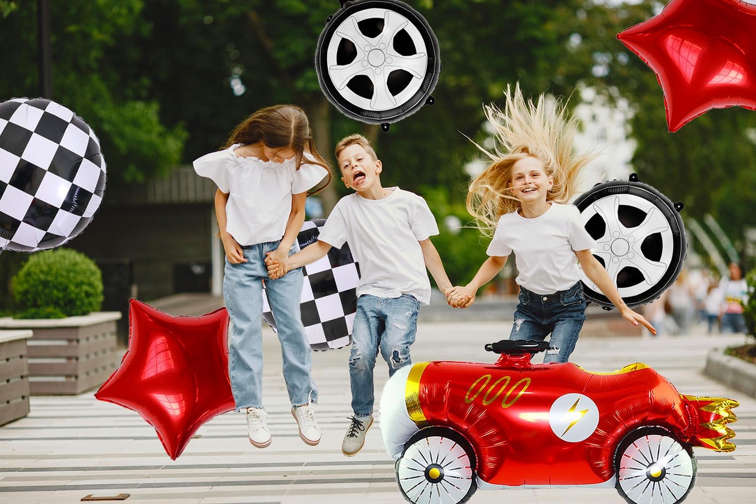 - γ Appearance and Design γ These aluminum foil balloons are designed in the shape of retro racing cars, wheels and tires, as well as black and white squares. The vivid and realistic appearance of the racing cars will attract the attention and interest of guests, bringing them a pleasant mood. You will receive 1 colorful racing balloon +2 wheel balloons +2 black and white checkered balloons +2 red star-shaped balloons (uninflated) + 1 ribbon roll.
