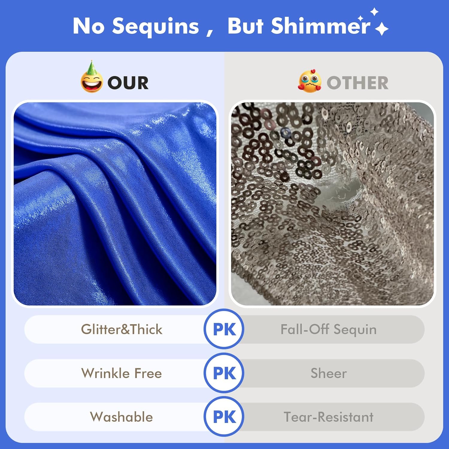 - Wrinkle-Free Backdrop Curtain - Our 10ft royal blue sequin glitter party background curtain panels are made of wrinkle-free material, which could be used without ironing. Let you make unforgettable memories for your family or your friends.