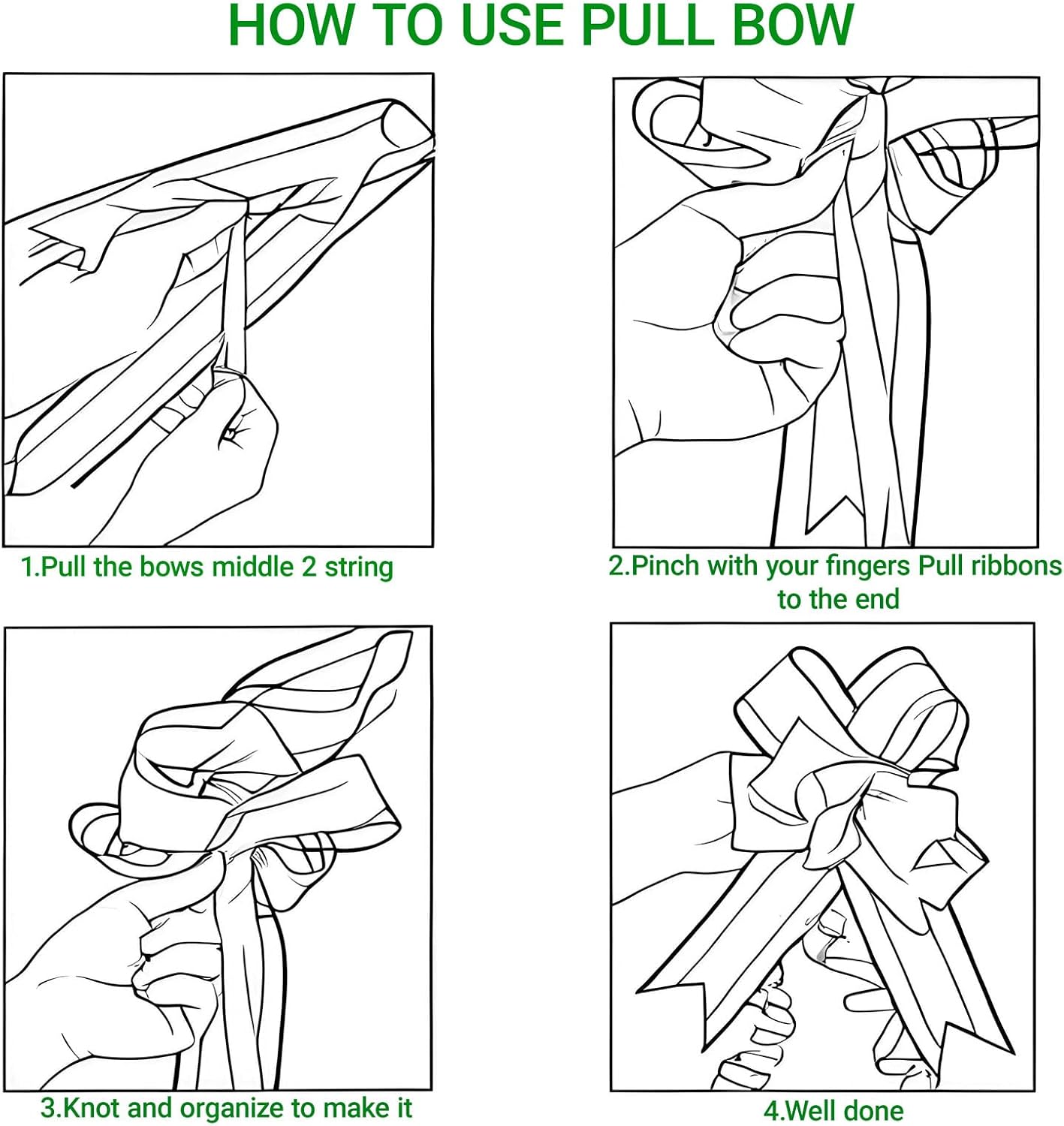 - GIFT BOWS EASY ASSEMBLY: Simple 4-step process to create beautiful bows - locate strings, pull drawstrings, secure with knot, and arrange into final shape