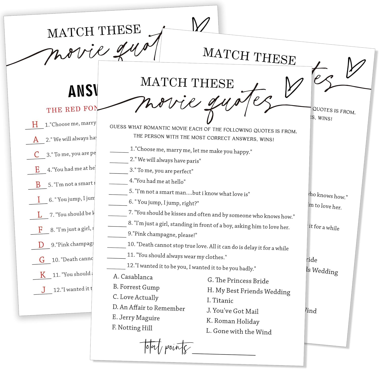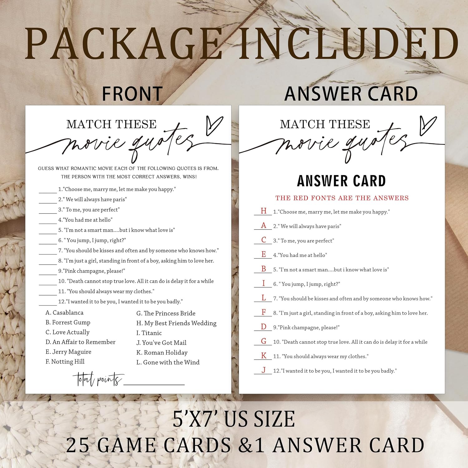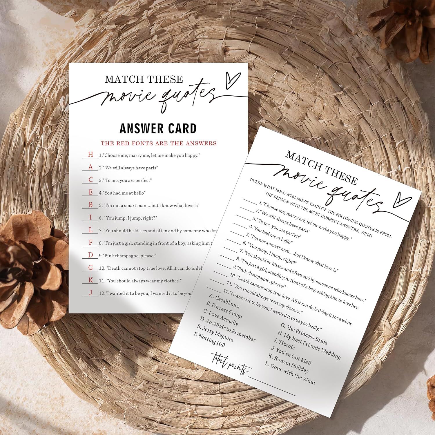 Fun Bridal Shower Games Set 25 Wedding Games Cards with 1 Answer Card Match Movie Quotes for Minimalist White Newlywed Party Entertainment Supplies - A02