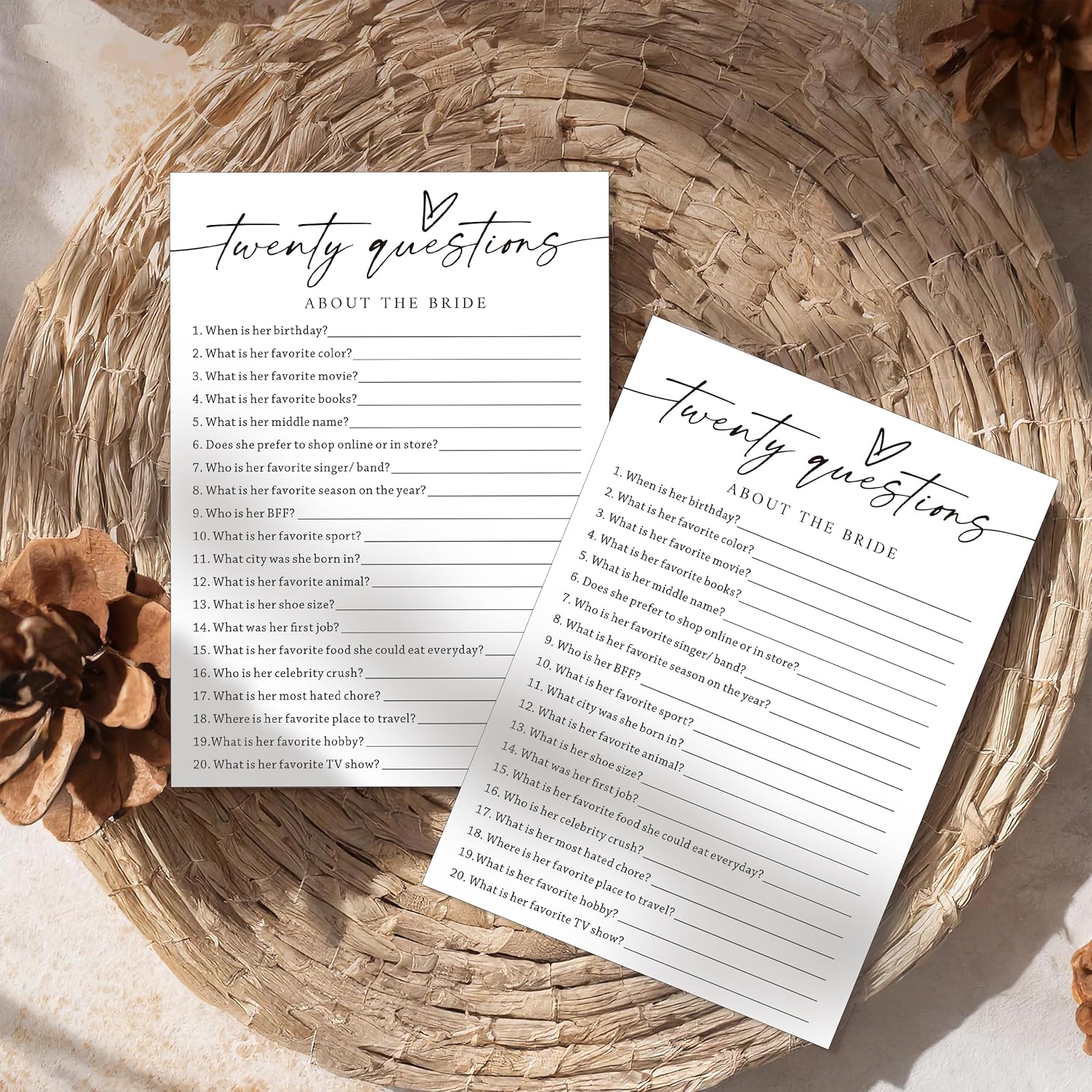 Fun Wedding Shower Games Cards, Twenty Questions About The Bride, Bridal Party Game and Favors for 25 Guests, Bridal Shower Decorations, Minimalist White Wedding Party Supplies - A07