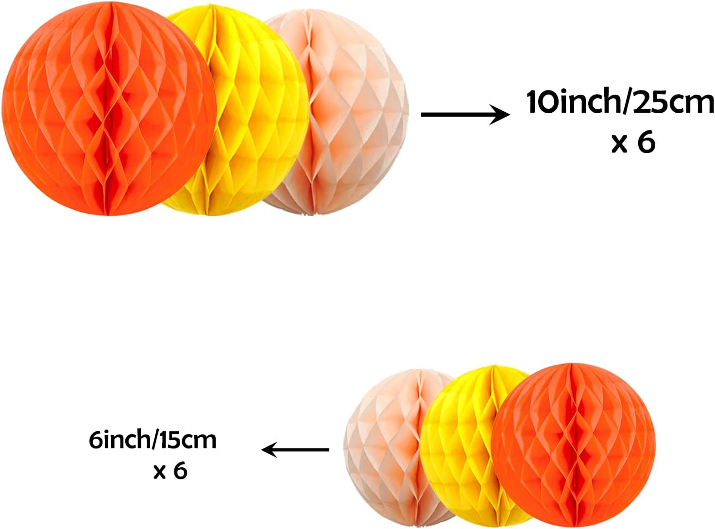 - HONEYCOMB DECORATIONS Package includes: 2 pcs 10" orange, 2pcs 10" peach and 2 pcs 10" yellow, 2pcs 6" orange,2pcs 6" yellow and 2pcs 6"peach honeycomb ball decorations.