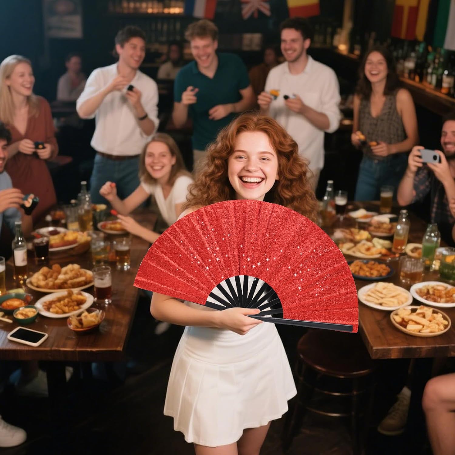 Glitter bling Large Folding Fan-Hand Fan Rave Clack Popping Fan for Line Dancing Clacking Fans for Boots On The Ground Dance, Party for EDM, Music Festival, Hot Flashes, Party, Decoration(1pcs red)
