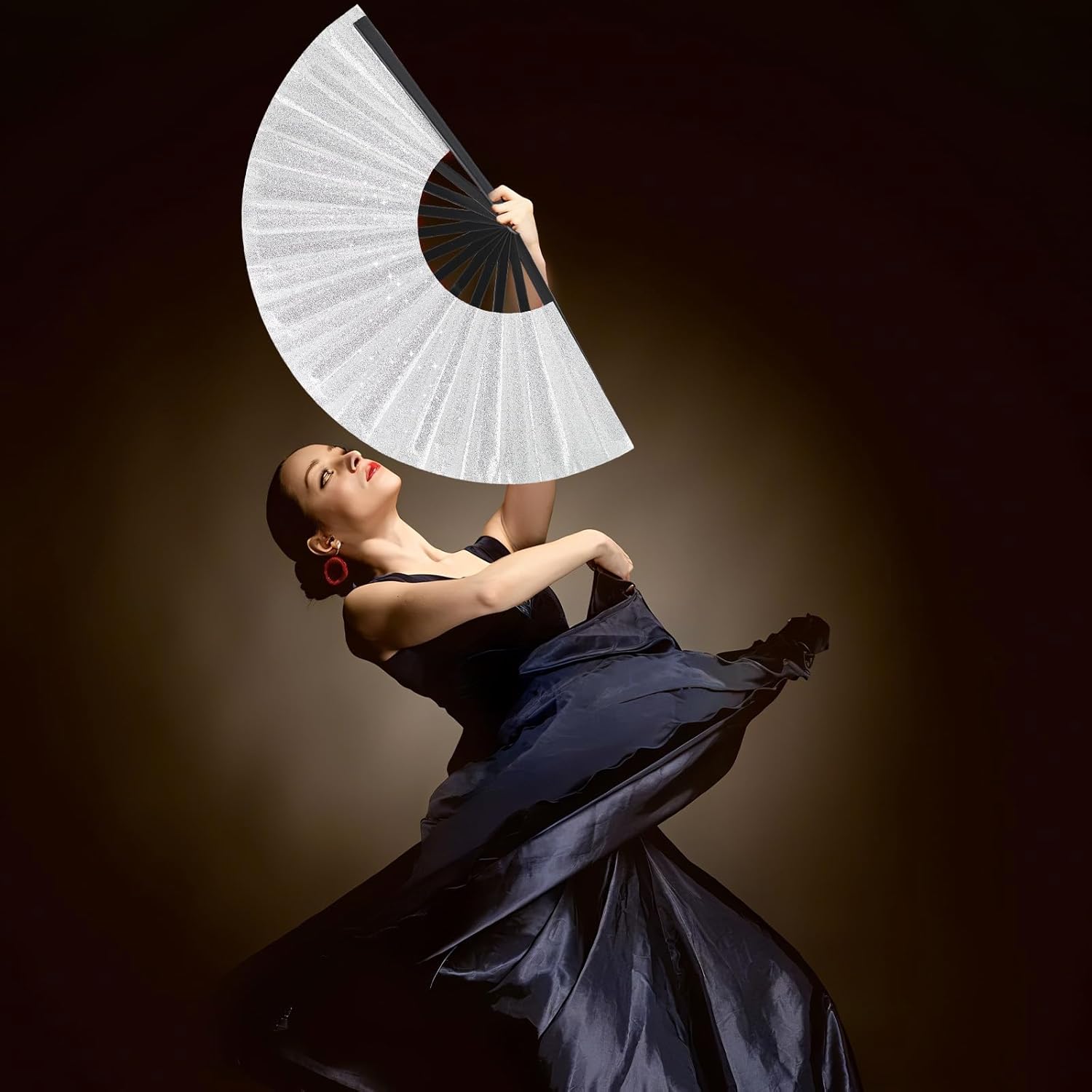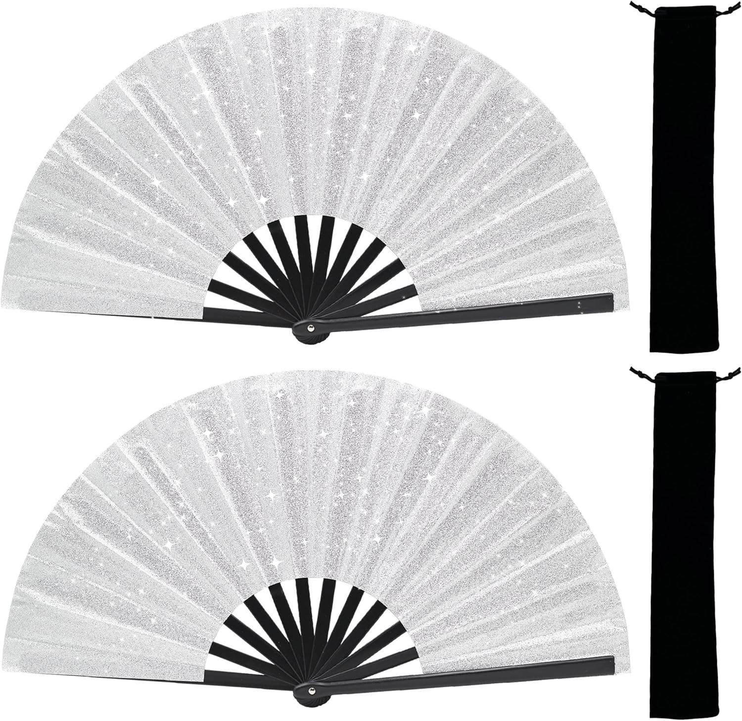 Glitter bling Large Folding Fan-Hand Fan Rave Clack Popping Fan for Line Dancing Clacking Fans for Boots On The Ground Dance, Party for EDM, Music Festival, Hot Flashes, Party, Decoration(2pcs silver)