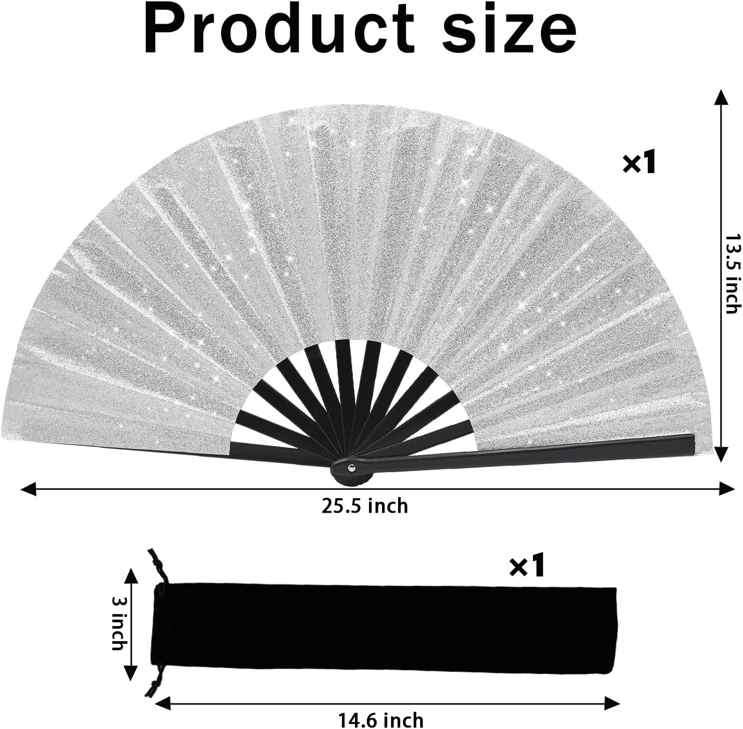 - Large Handheld Folding Fan Size: Folds to compact size 13 x 1.5 x 1 inches. Unfolding size 13 x 25 inches. With a larger size than most hand fans, this product is great for creating an even bigger impact at raves, music festivals, and other events.