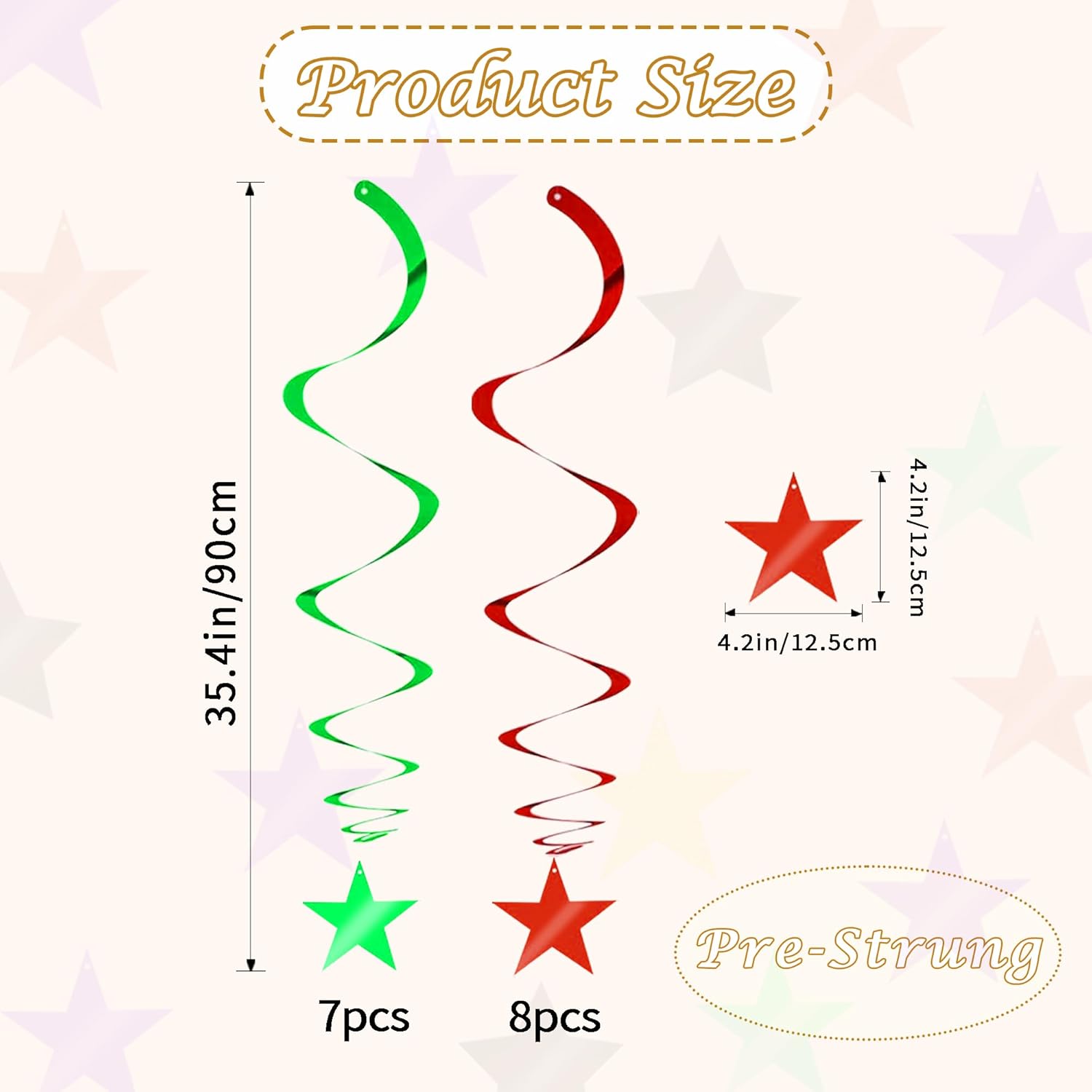 - 【Package include】A total of 15 pcs hanging swirl decorations, including 15 double swirls and 15 swirls with PVC star. There are 15 strings in total, each of which is connected with a double swirls and a PVC star. Flexible swirls, hanging length can extend to approx 36"/91cm long.