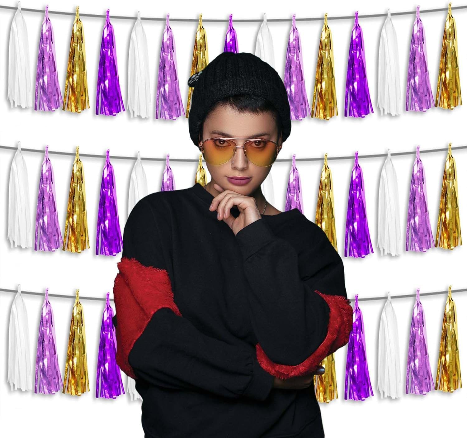 - 【Package Includes】The total length of them Purple Gold birthday tassels banner is 30 feet, divided into 3 strips, each 10 feet long. Each banner contains 15 tassels, and each tassel measures 14 inches, for birthday decorations many occasions uitable for Patriotic display, Homecoming Float, Christmas Float, ecorative metal trailers, graduation floats etc