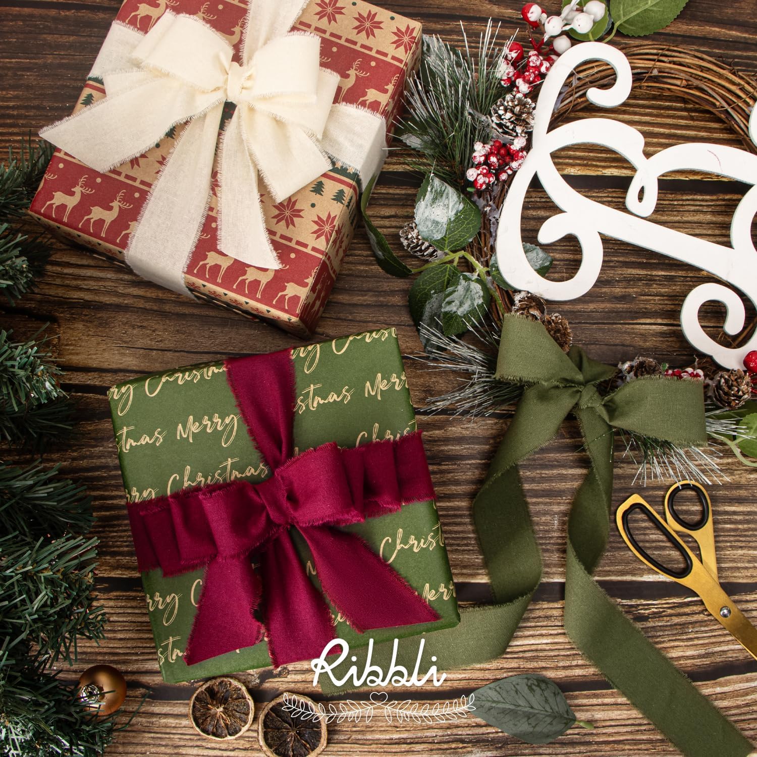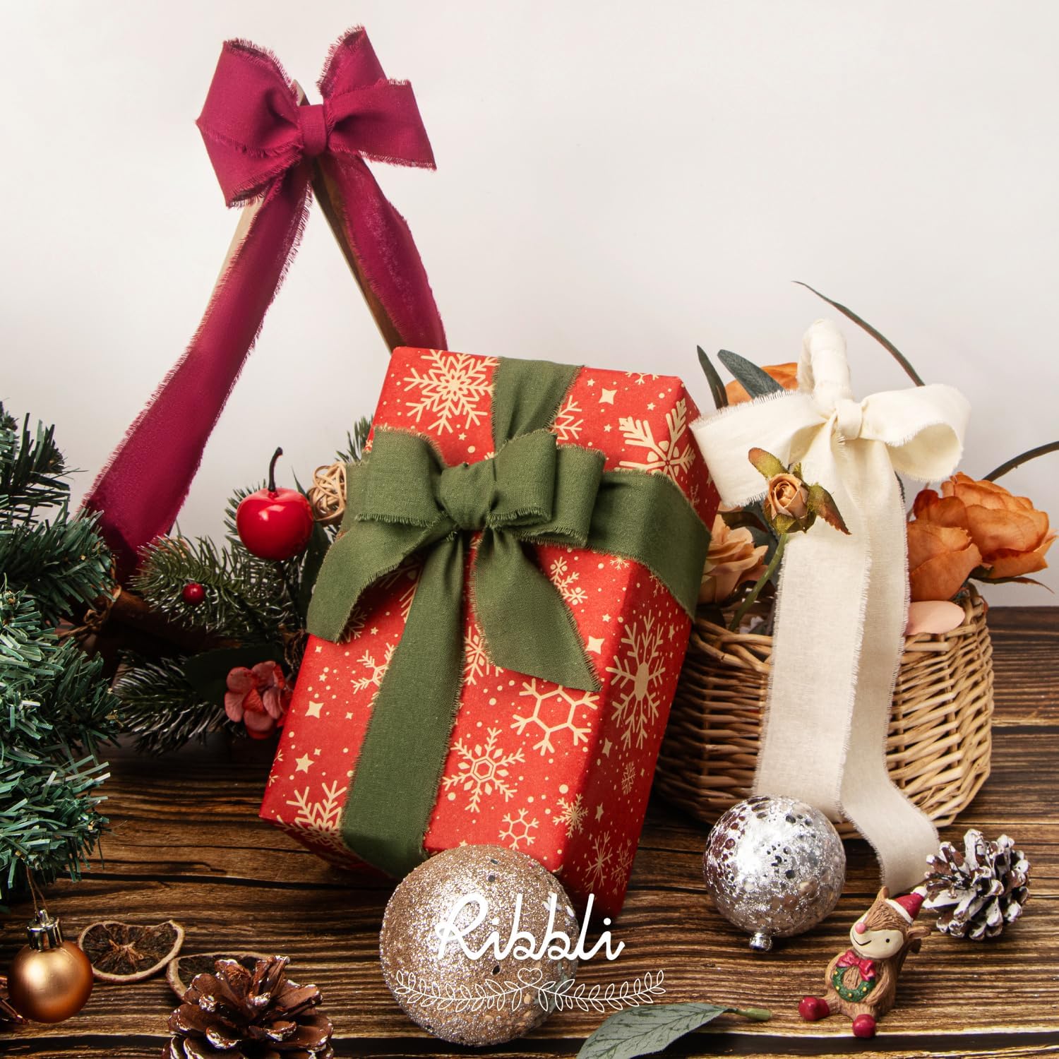 Ribbli 3 Rolls Christmas Ribbon 1.5 Inch x 18 Yards Ivory Burgundy Moss Handmade Cotton Frayed Fringe Ribbons for Gift Wrapping Wedding Invites Bridal Bouquets DIY Crafts Christmas Home Decor