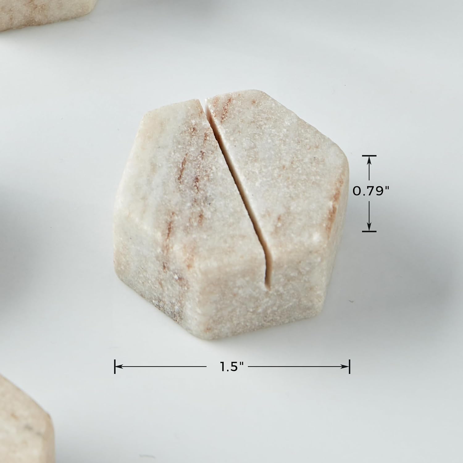 - [Size] This set includes 4 hexagonal marble place card holders. Each measures 0.79" in height and 1.5" in diameter, featuring a slot to securely hold place cards. For maintenance, simply wipe clean with a damp cloth