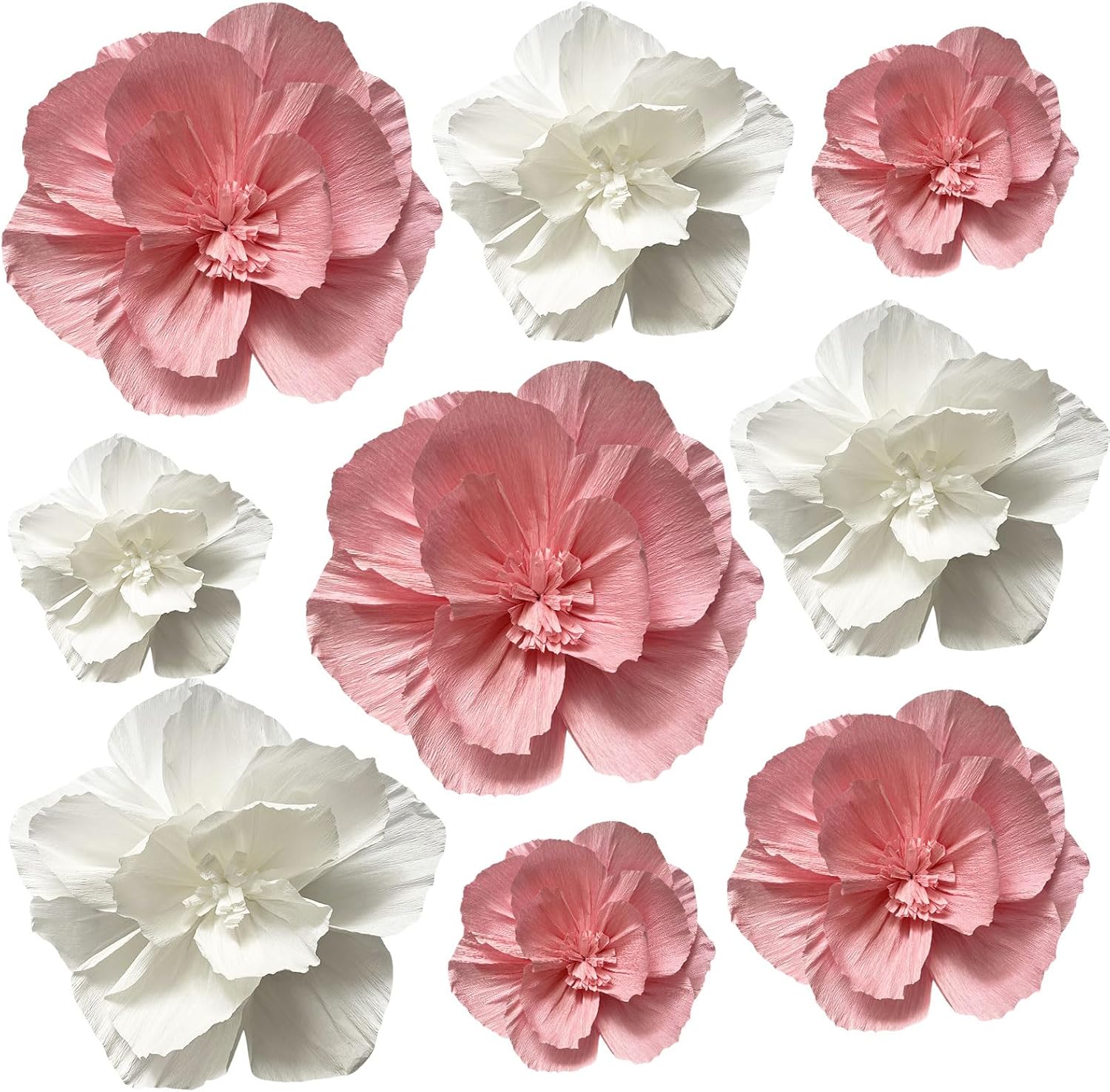 BRT Bearingshui Crepe Paper Flowers Decoration for Wall Total 9 Pcs, Artificial Flowers Backdrop for Wedding Decor Baby Bridal Shower Birthday Party, Pink and White 3D Wall Flowers Decor