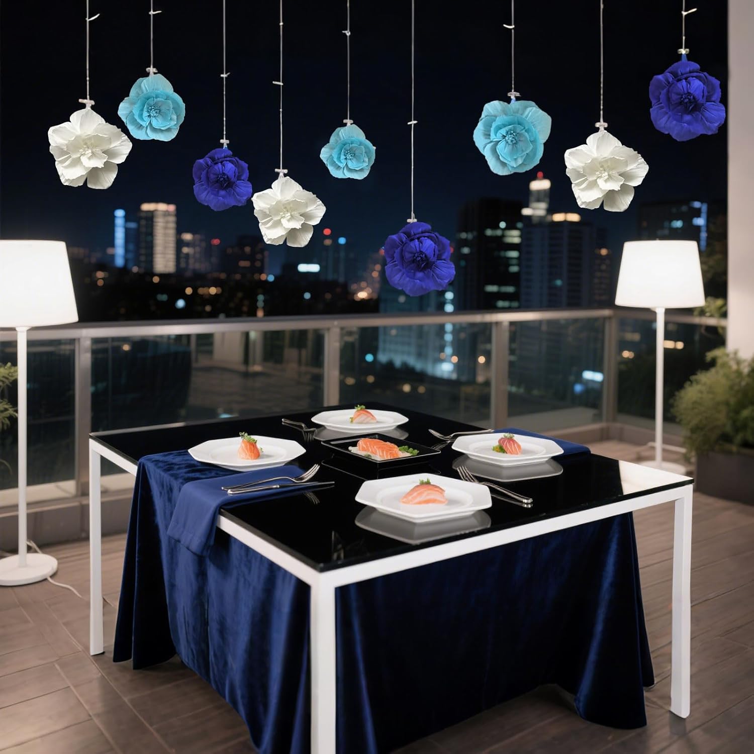- Crepe Paper Flowers: Total 9pcs navy blue light blue white paper flowers in 3 sizes 12”, 10”, 8”.