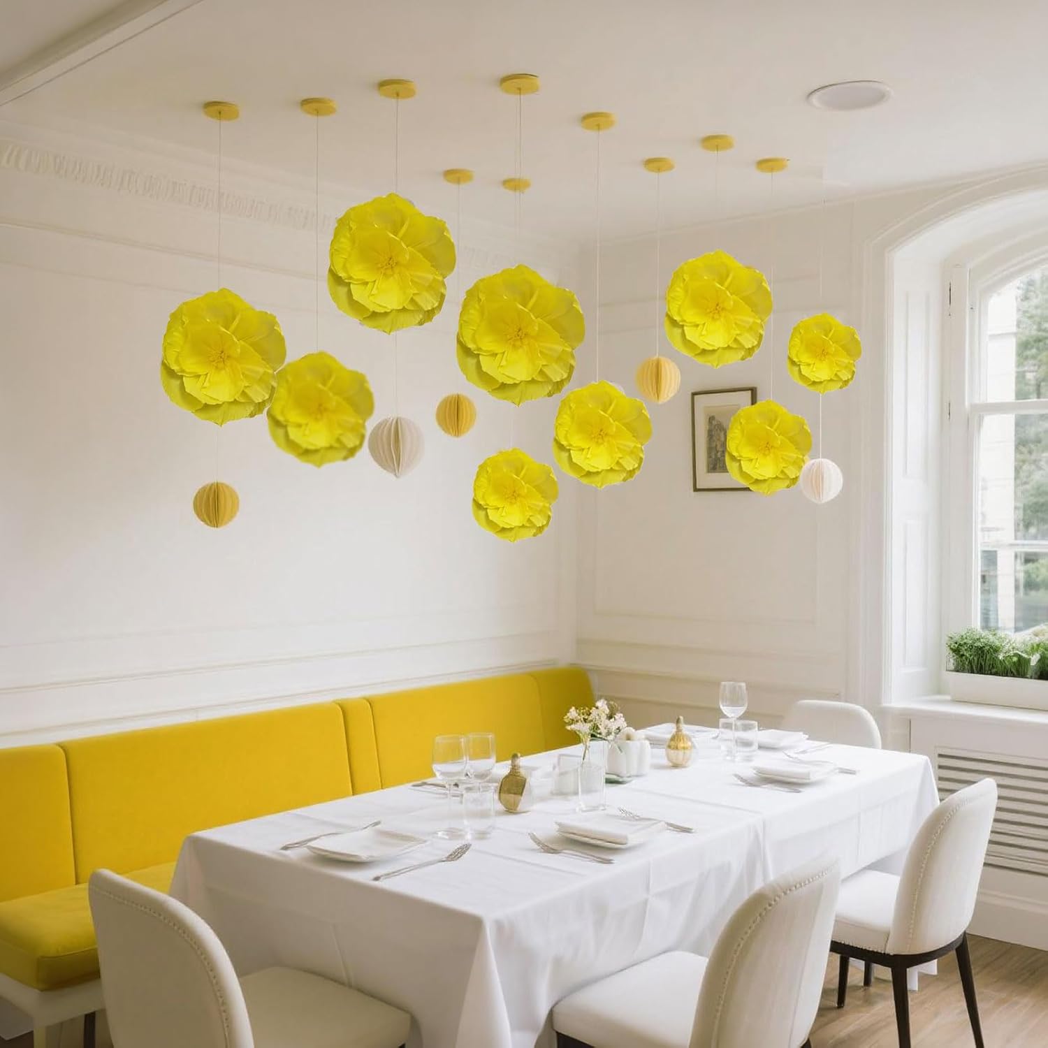 - Crepe Paper Flowers: Total 9pcs yellow paper flowers in 3 sizes 12”, 10”, 8”.