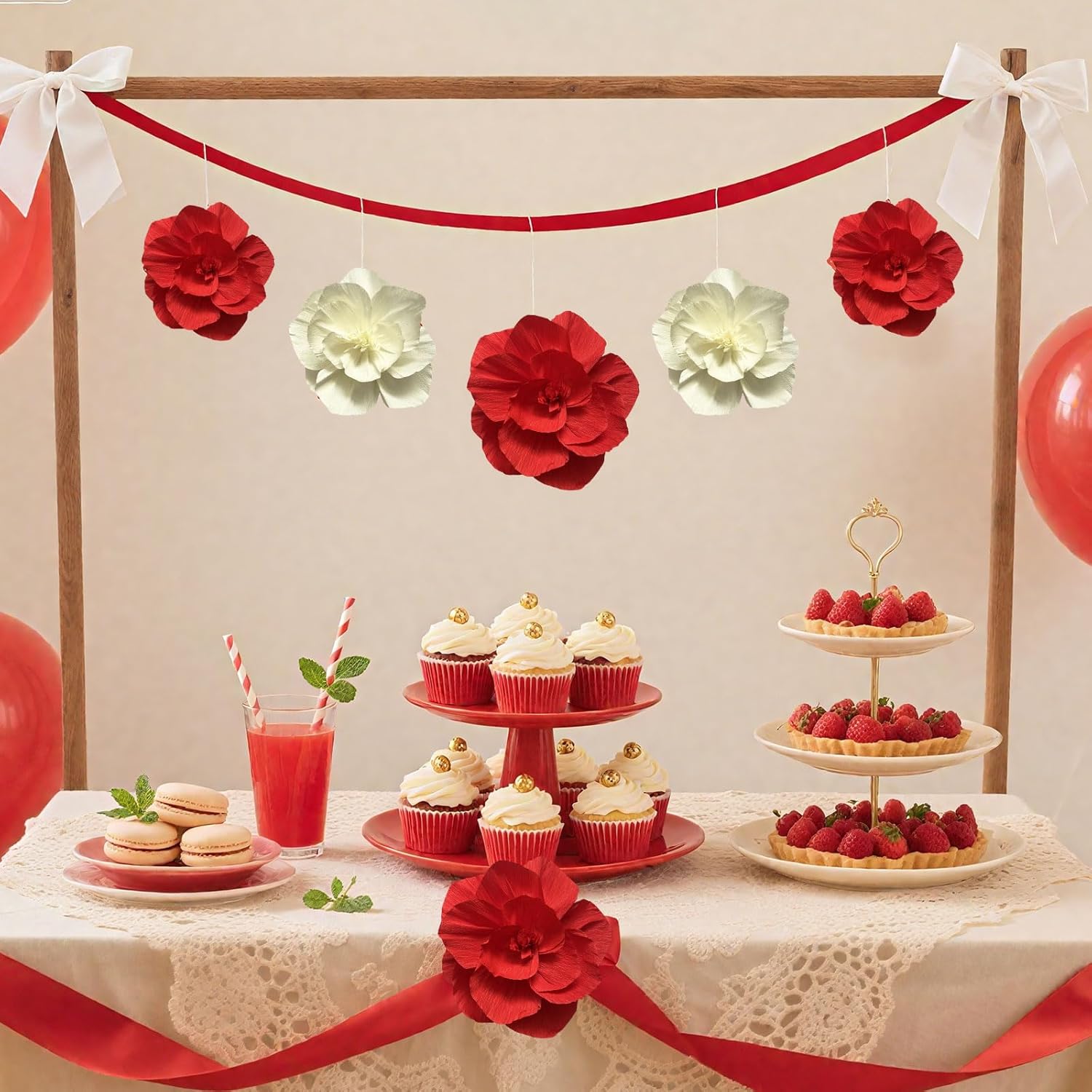 - Crepe Paper Flowers: Total 9pcs red and beige paper flowers in 3 sizes 12”, 10”, 8”.