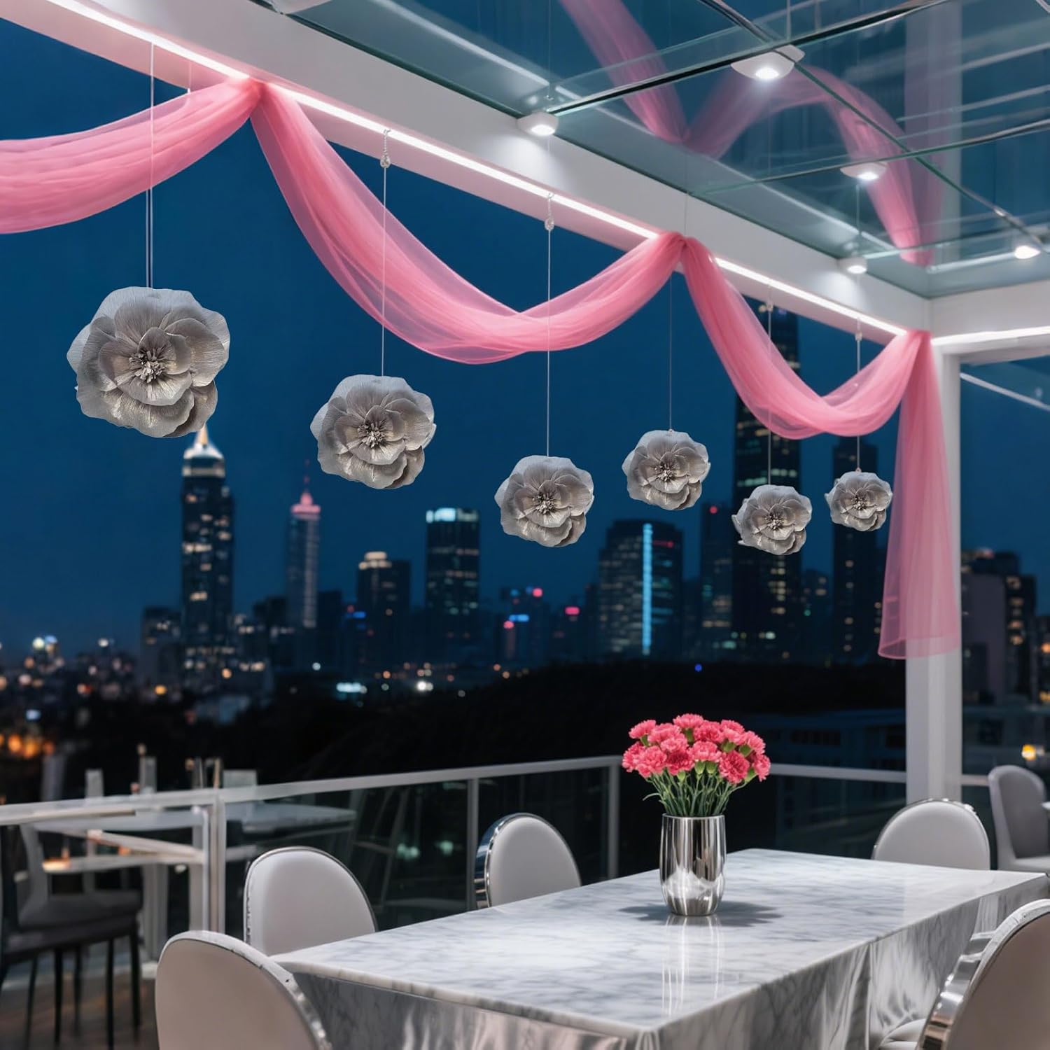 - Crepe Paper Flowers: Total 6pcs silver paper flowers in 3 sizes 12”, 10”, 8”.