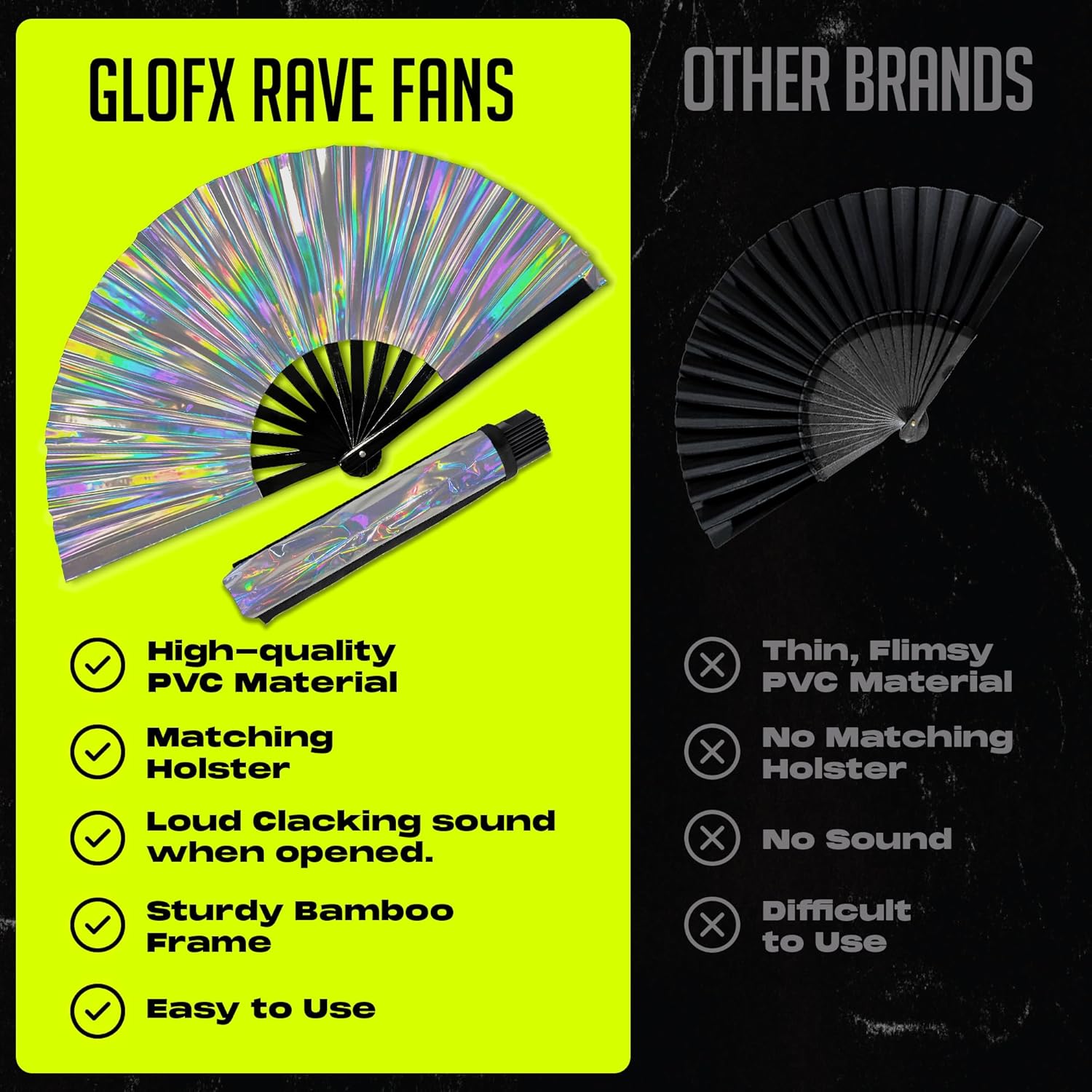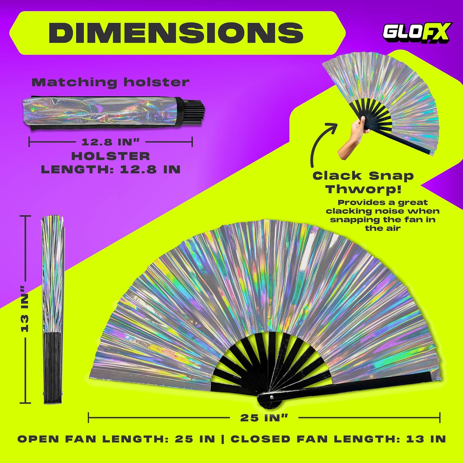 - HOLO HOLSTER INCLUDED – Comes with a matching holographic belt holster so you can keep your fan close without having to carry it by hand. Great for hands-free dancing.