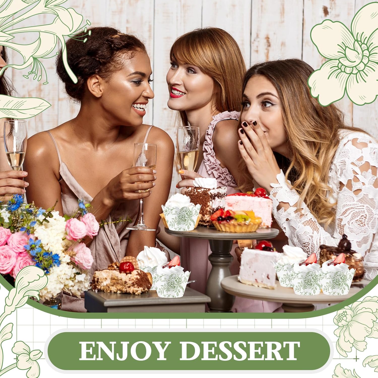 Domensi 100 Pcs Cupcake Wrappers Rustic Cupcake Liners Baking Cups Baking Liners for Wedding Bridal Baby Shower Birthday Party Supplies Dessert Decoration(Green, Floral)