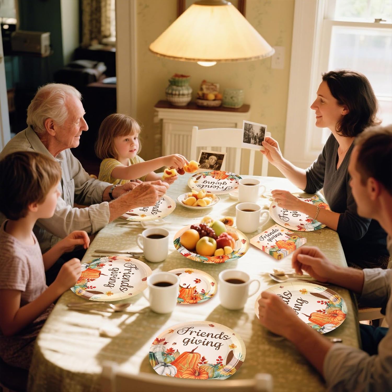 - Friendsgiving Plates: Be the host everyone remembers! Friendsgiving party supplies plate showcases elegant handwritten "Friendsgiving" script surrounded by harvest motifs –Rich in detail and overflowing with festive cheer, friendsgiving plates set captures the true spirit of gratitude and togetherness – making every moment at your table picture-perfect