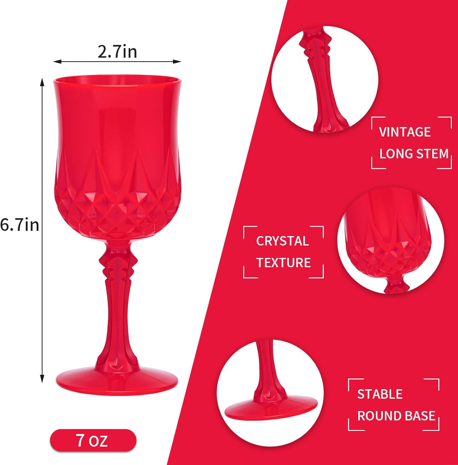 - Perfect Size & Capacity : Each plastic crystal water goblets measures approximately 6.7 x 2.7inches with a 7 oz capacity – the ideal size for serving wine, champagne, cocktails, beer, whiskey, soda, iced water, and even small portions of dessert like mousse or fruit compote. The ergonomic stemmed design makes it easy to hold.Plus, the smooth inner wall and wide opening make cleaning a breeze. Note: Not suitable for boiling hot liquids, dishwashers, or microwaves.