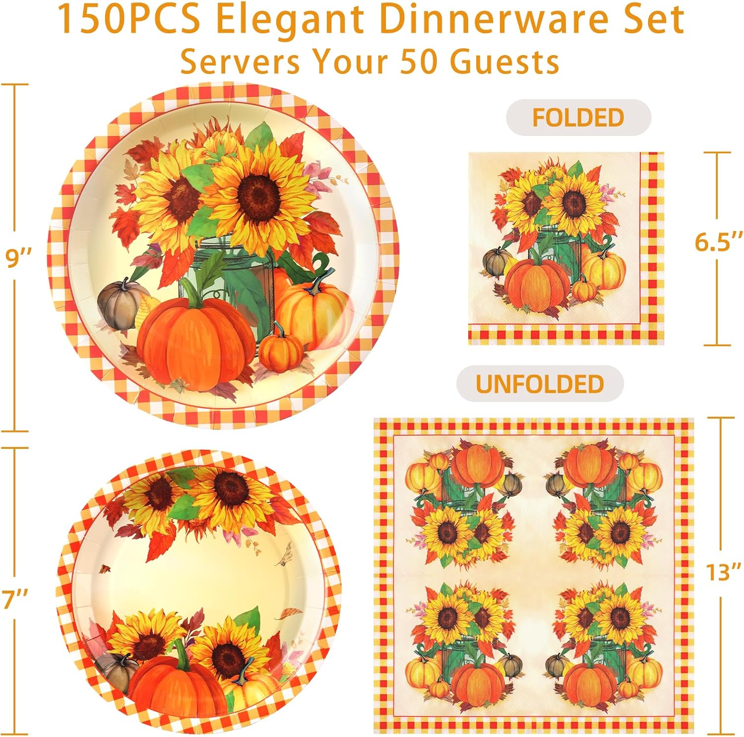 Sunflower Plates and Napkins Set for 50 Guests – Disposable Fall Party Supplies, Pumpkin Design for Sunflower Thanksgiving Party Decoration