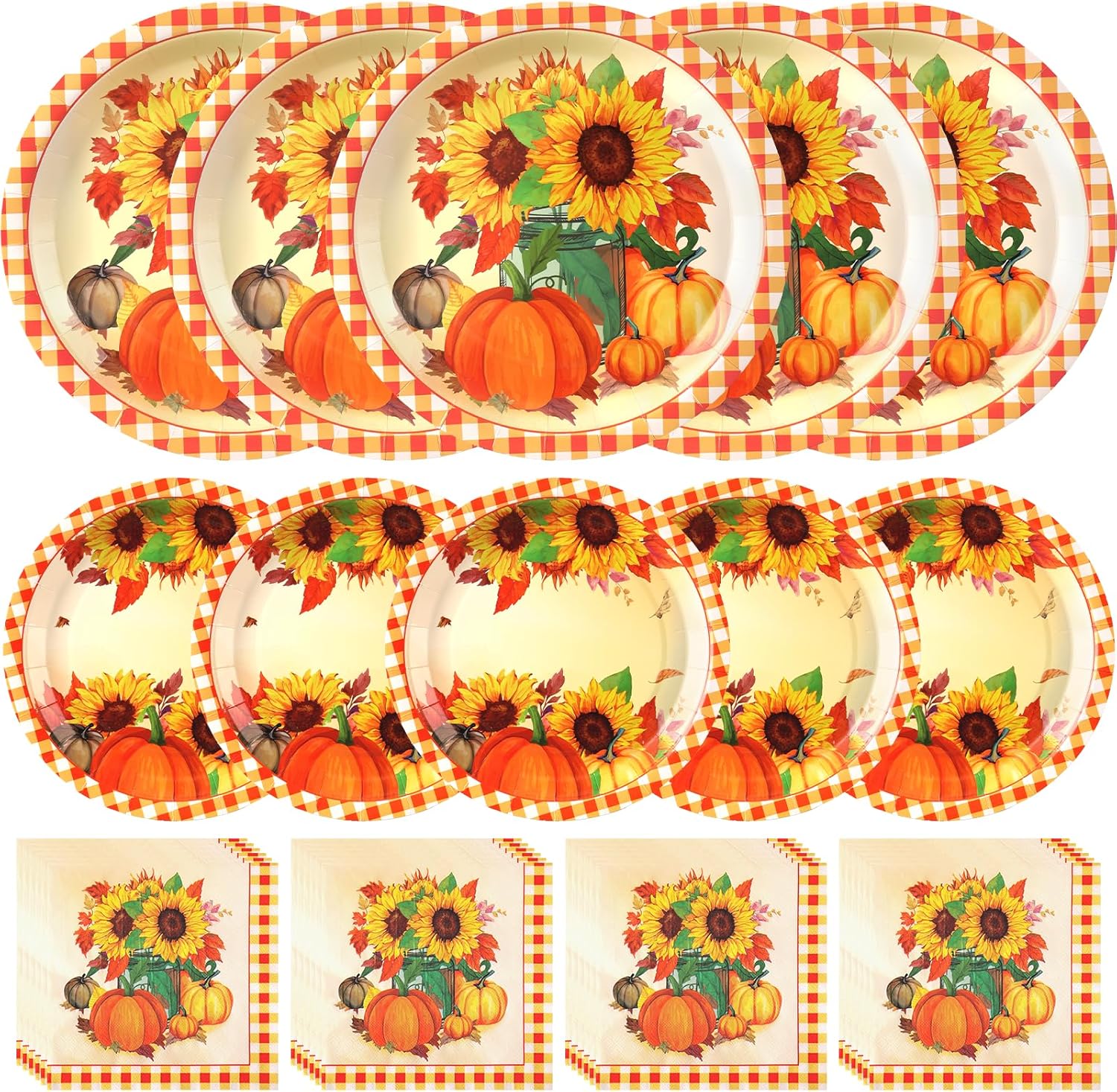 - Celebrate the Harvest Season: Sunflower birthday decorations plates napkins are adorned with vibrant sunflowers, pumpkins, and autumn leaves, all symbols of Thanksgiving and the harvest season. The checkered border adds a cozy and festive touch, making it perfect for parties and celebrations