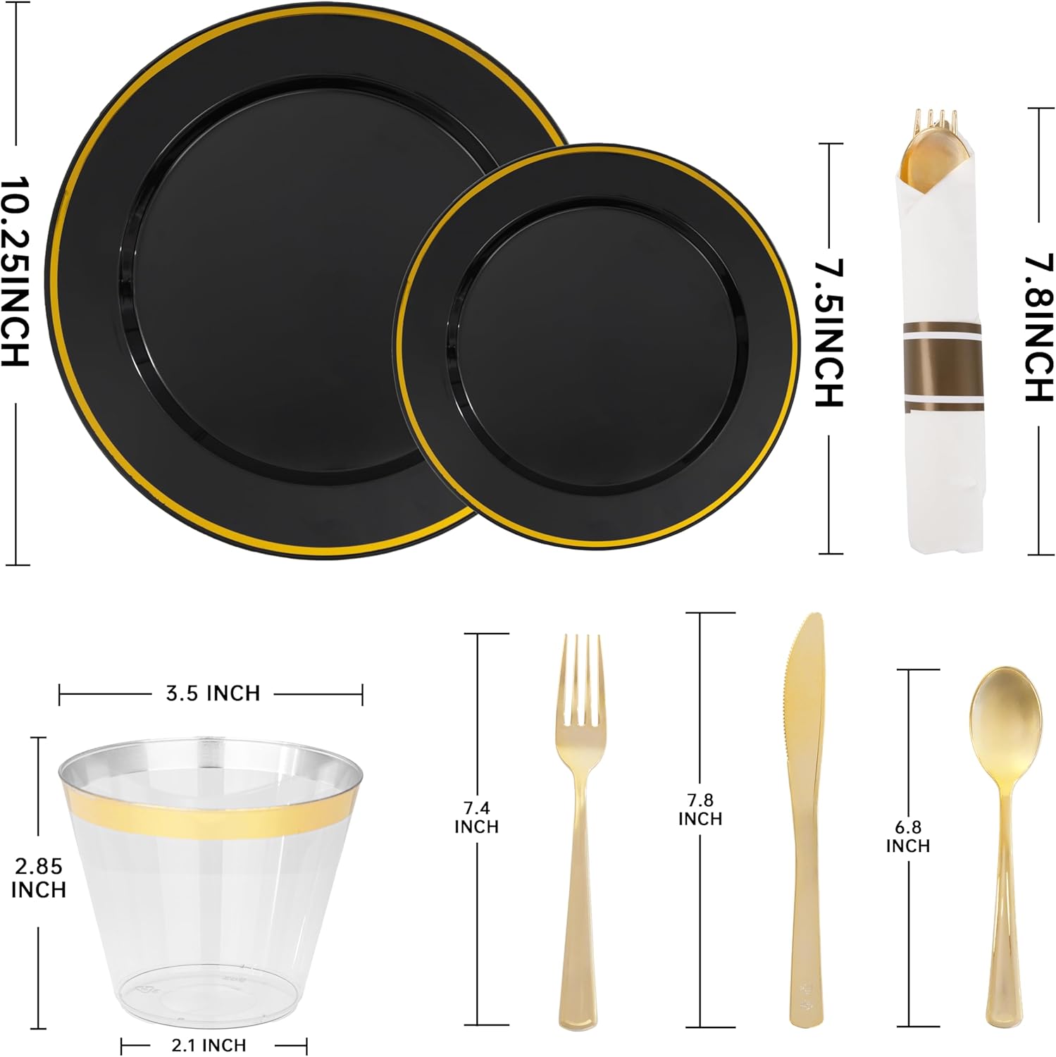 - Elegant Design for Every Occasion: Our SUT 175 Pcs black and gold Plastic Dinnerware Set combines the sophistication of black plastic plates with luxurious gold accents, making it an ideal choice for wedding plates, Halloween parties, and upscale gatherings.