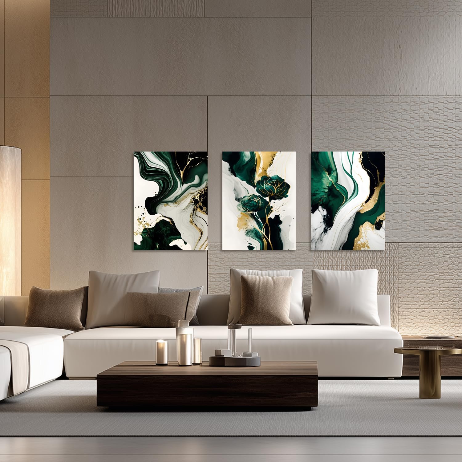 - Elegant Green Abstract Design: This 16"x24" 3-piece green wall art set features a luxurious abstract pattern in emerald and olive tones, accentuated with marbled black and shimmering gold strokes. Each panel is visually captivating, combining modern fluid aesthetics with floral-inspired shapes, creating a dynamic and rich atmosphere.