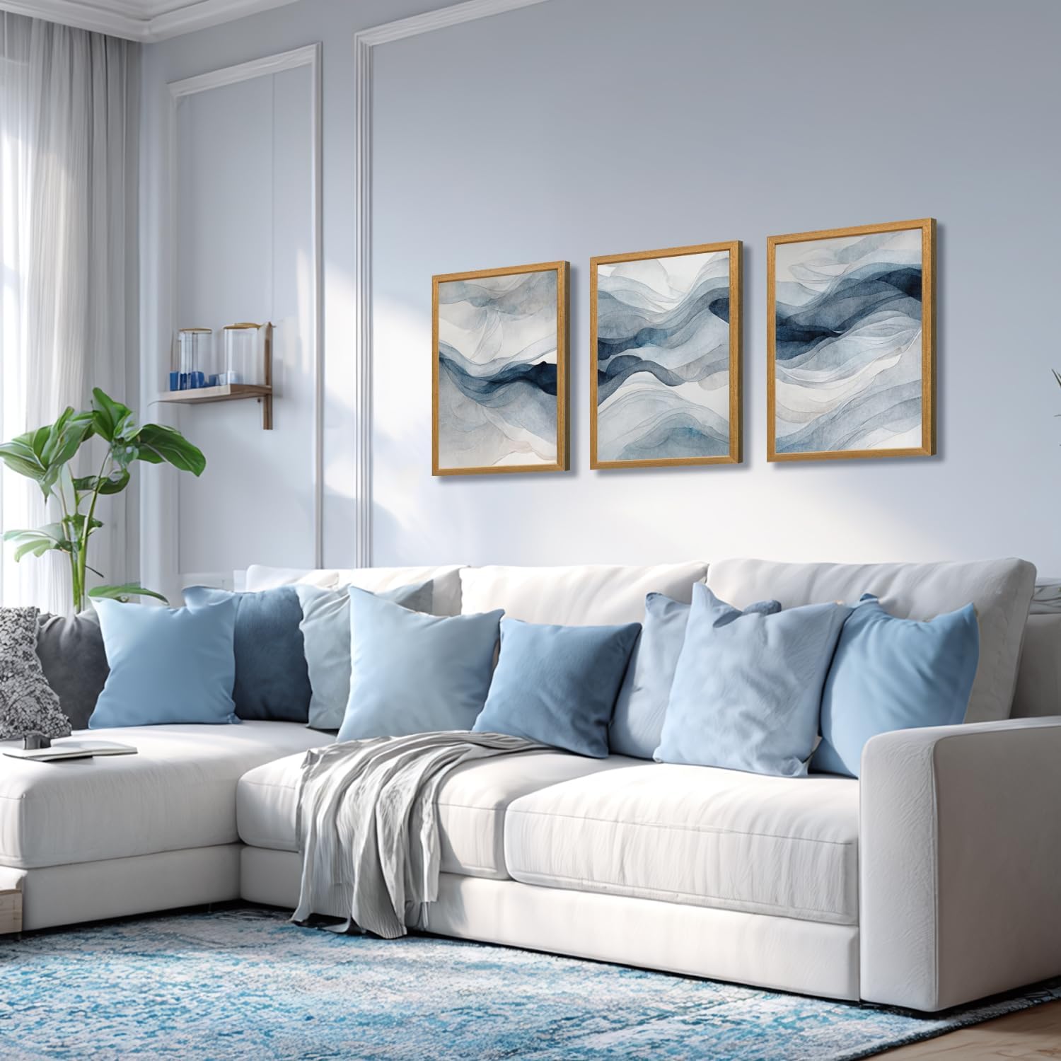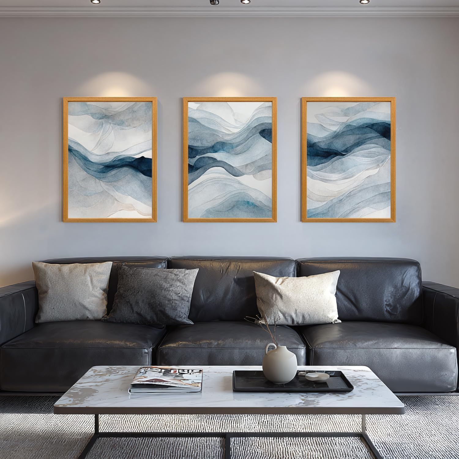 - Elegant Blue and Gray Abstract Design: This modern blue wall art set features abstract watercolor waves in deep navy, light blue, soft gray, and white tones. The fluid motion and gradient layers bring a calm yet dynamic aesthetic, perfect for adding a stylish touch to any living room or bedroom wall.