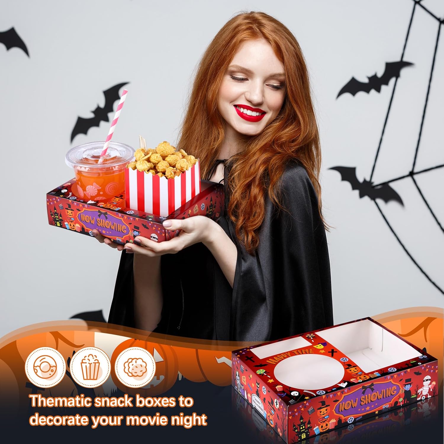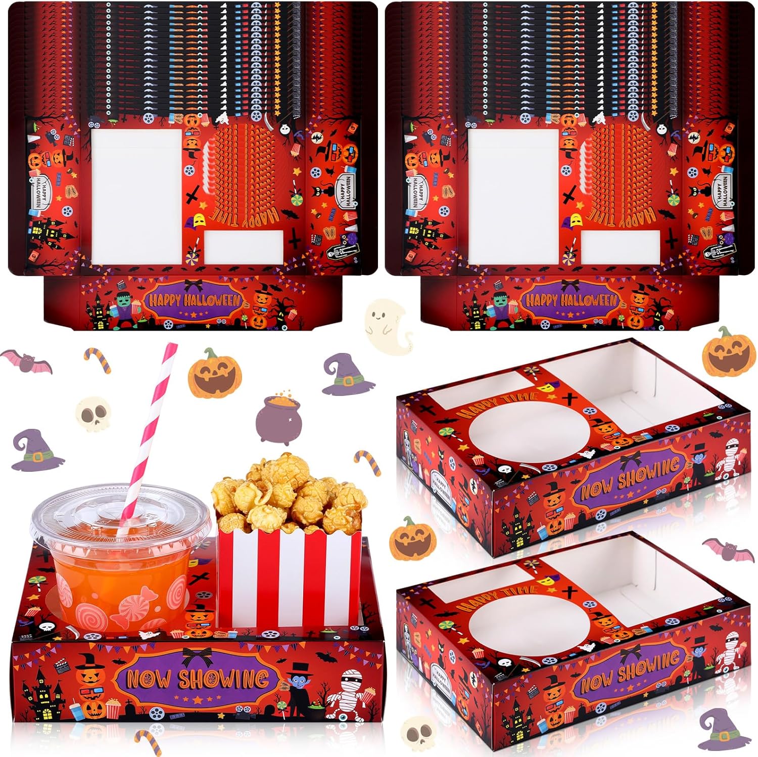 - Halloween Design: the Halloween movie trays for movie night are full of movie related elements such as pumpkin, ghost, cat, film reels, fries, chips and many other Halloween movies themed motifs to make them fit the theme of the movie, and make your movie going experience more comfortable