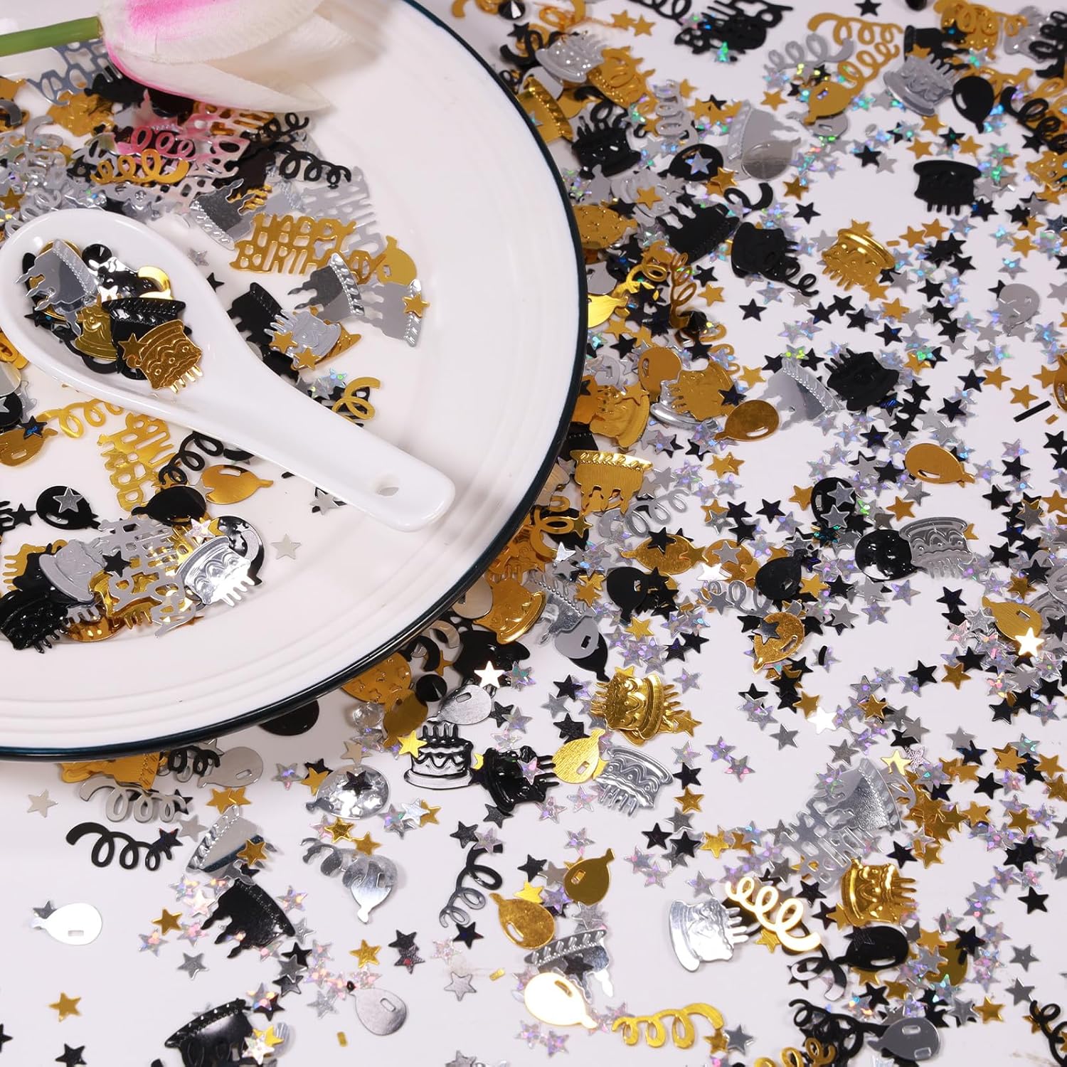 - Vibrant Color Combination: the classic silver, black and gold confetti party supplies, the table scatter confetti is made of PVC, delicate and vivid, these table confetti are very shinning under the light, easy to match birthday party
