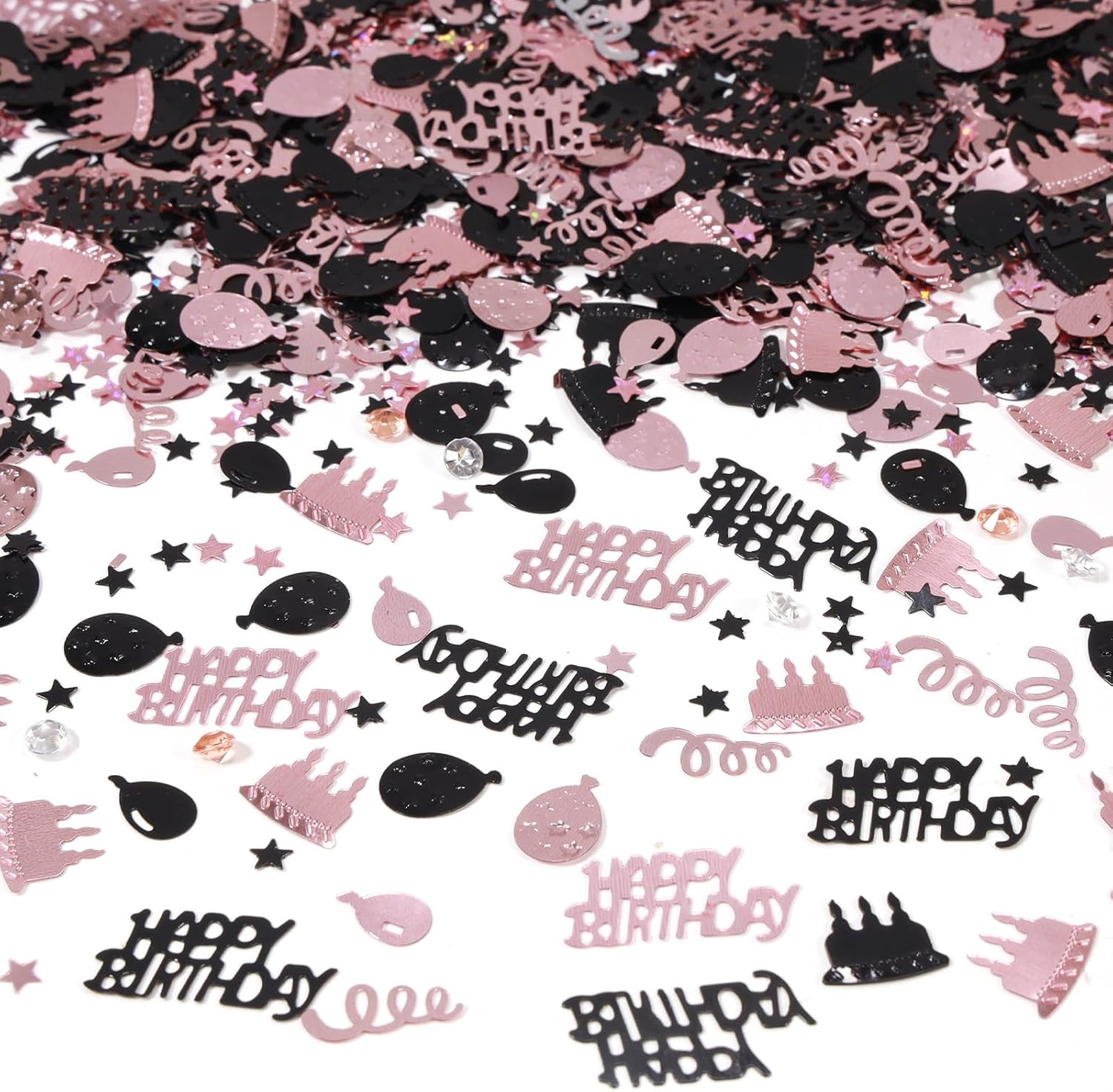 Rose Gold and Black Happy Birthday Confetti, 3000 Pcs Birthday Cake Table Metallic Foil Confetti Party Table Decor for Party, Baby Shower, DIY Arts and Crafting