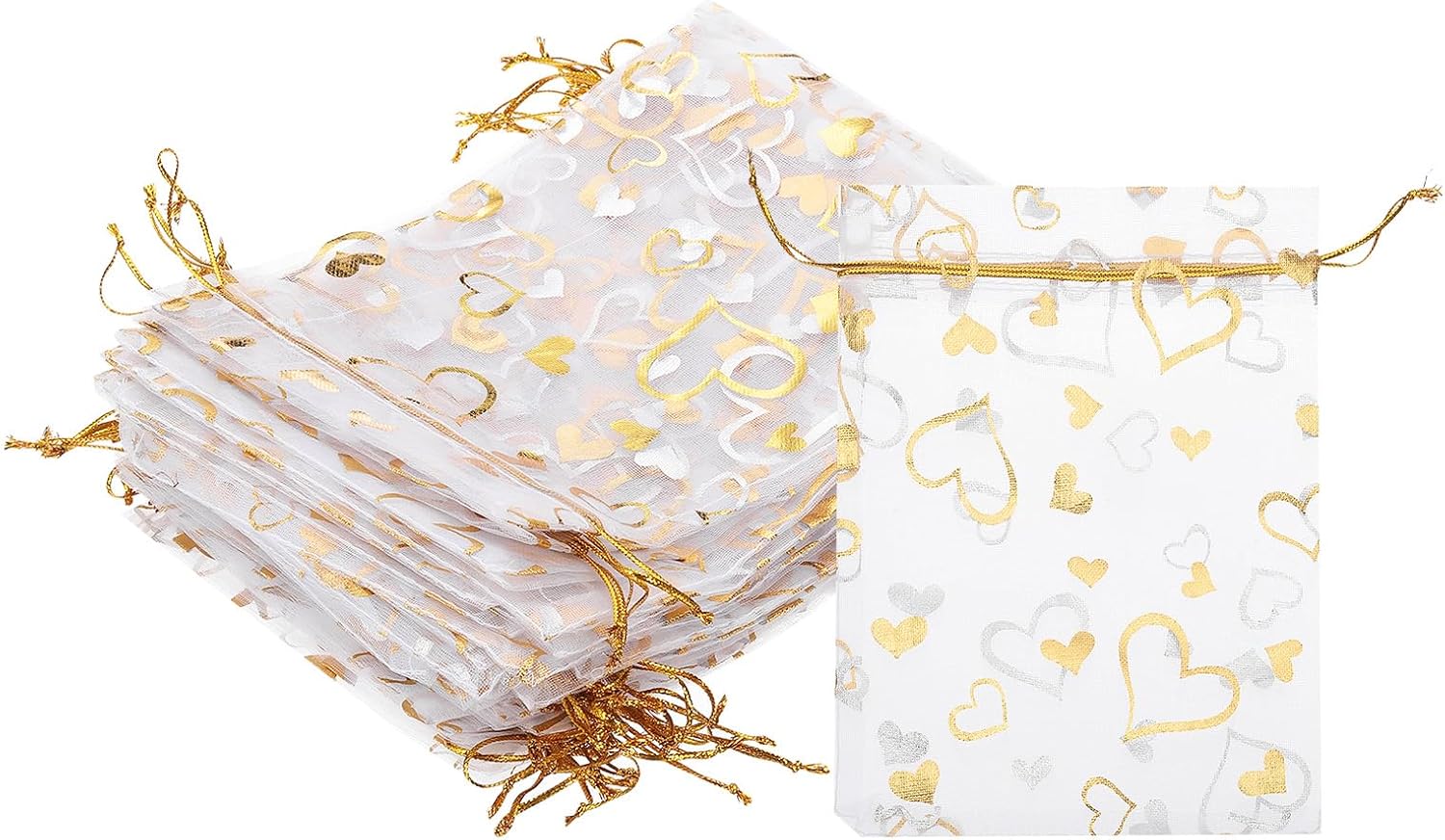 - Color: Gold Silver; Material: Polyester; Size: 18x13 cm/7.09x5.12 Inch(L*W); Packing List: 100 Pcs x Heart Printed Organza Bags (NOTE: Please confirm the size before choosing our product)