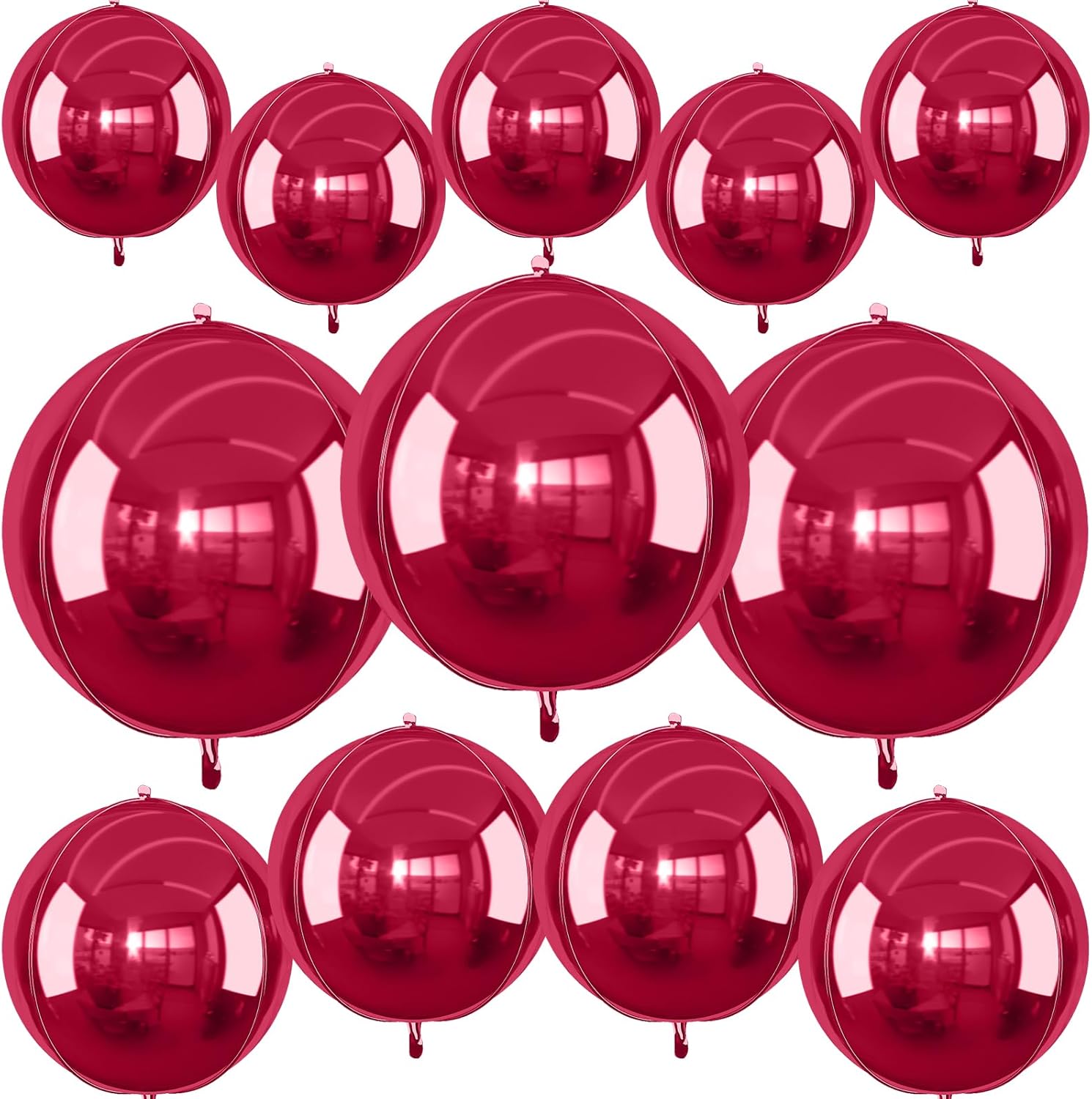 - Package: You will receive 12pcs 4D burgundy round foil balloon, 3pcs 22inch + 4pcs 15inch + 5pcs 10inch + 1 straw + 1 roll of ribbon. Different sizes balloons in can meet your party needs. 10inch mini size balloons do not support helium filling and floating. The classic solid burgundy chrome balloons are perfect for any red-themed party.