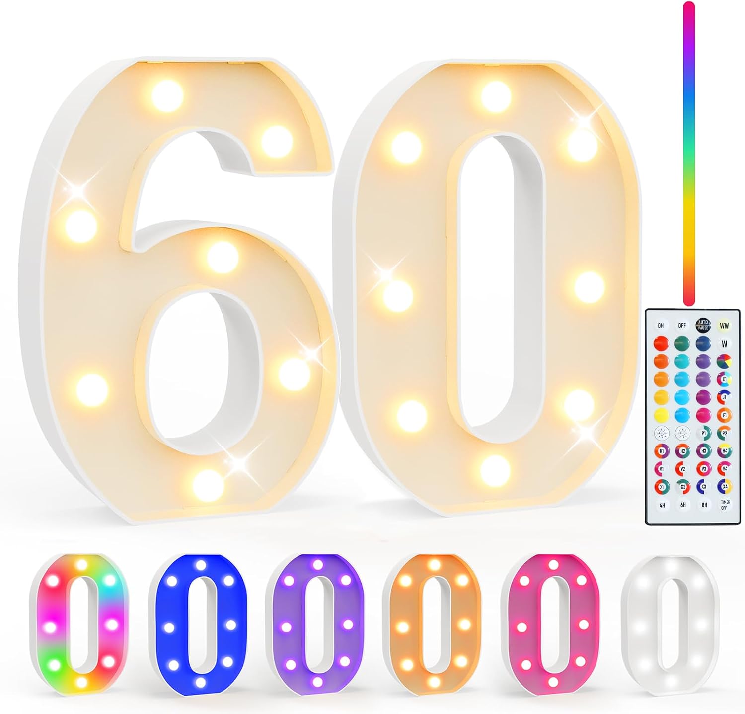 Pooqla 60th Birthday Decorations for Men Women, 35 Colors LED Light Up Numbers with Remote, Multicolor Marquee Numbers 60 Sign for Party Wedding Anniversary Decor 60th Birthday Gift, Number 60