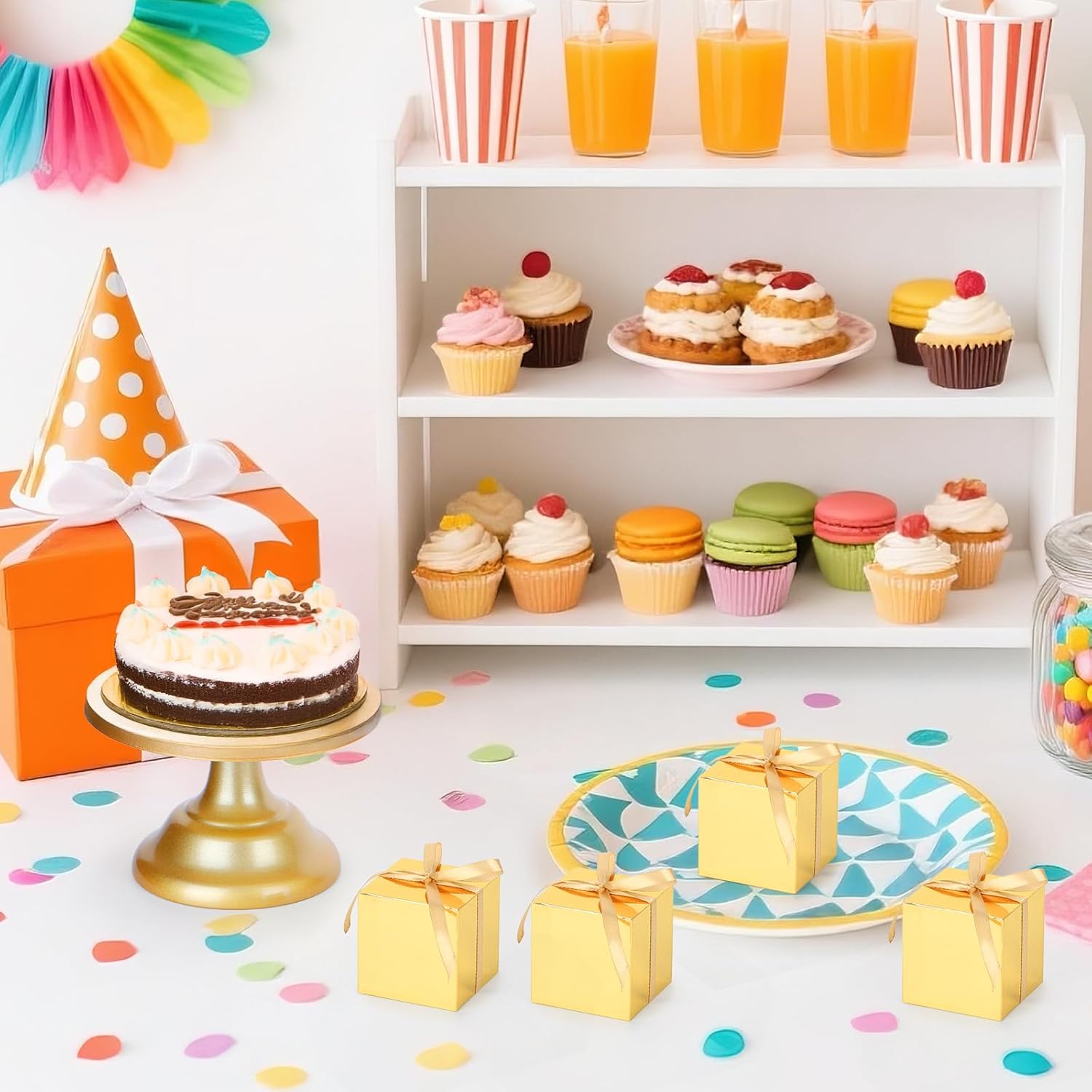 EUSOAR Candy Boxes Party Favors, 60pcs 3x3x3 Inches Gold Macaron Boxes Small Gift Box with Ribbon, Cube Thank You Gifts Box Macaron Mini Muffins Container for Wedding Bridal Party Favor Decorations