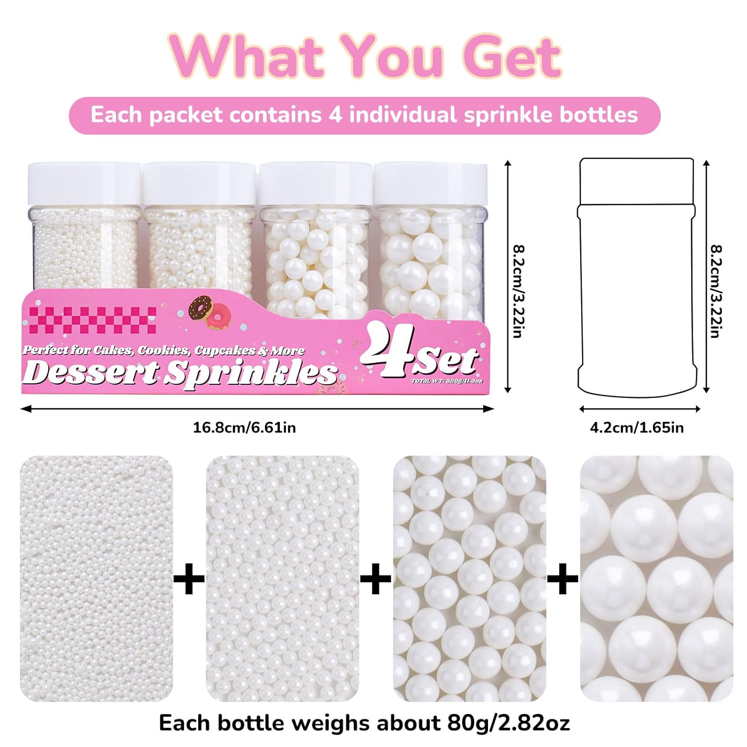 White Pearl Sprinkles for Cake Decorating, 11.3 Oz Edible Pearls Sugar 4 Sizes Gift Box Set for Baking Cookie Ice Cream Cupcake Toppings