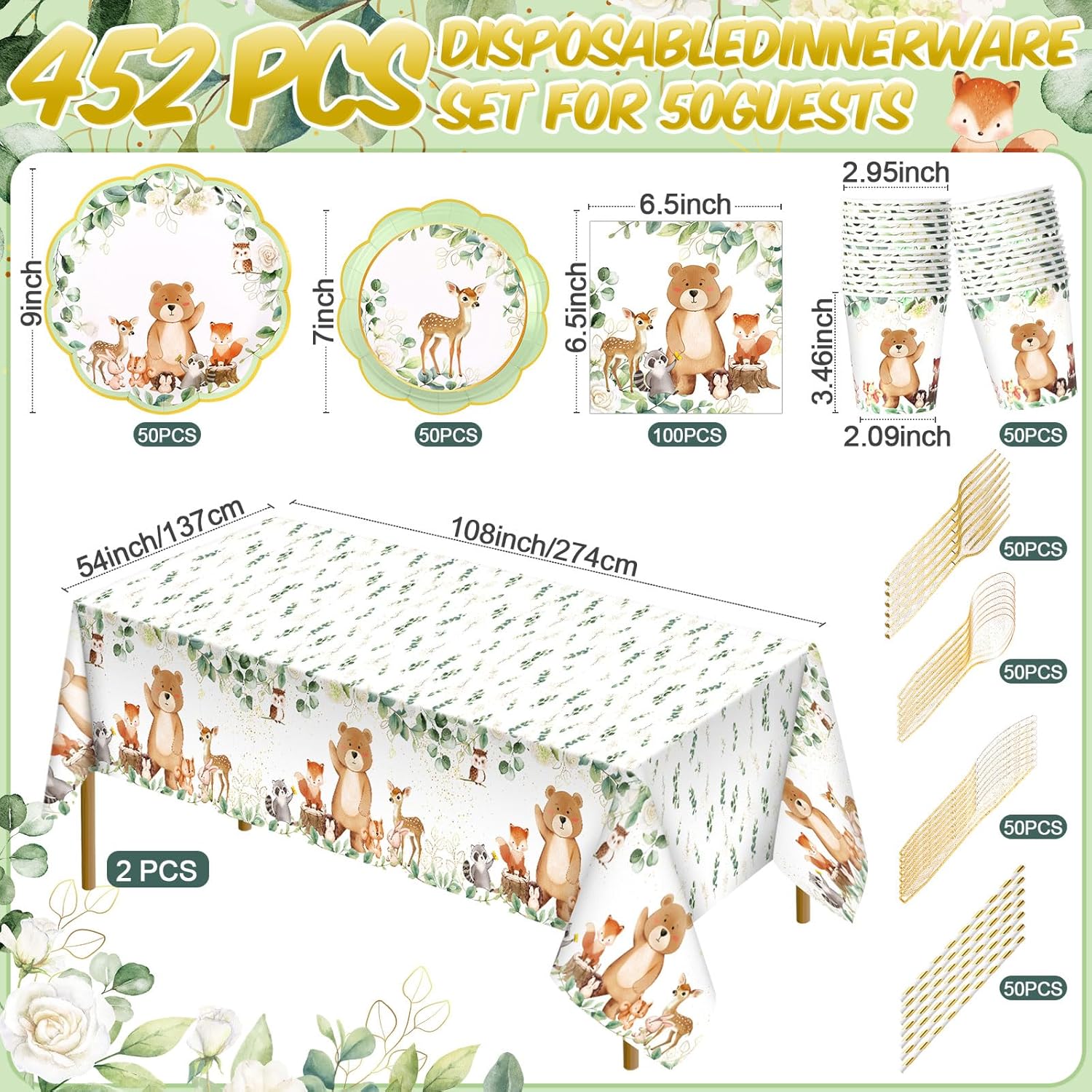 452 Pcs Woodland Party Decoration for 50, Woodland Animal Baby Shower Paper Plates Napkins Cups Tablecloth Cutlery Straws for Forest Wild Safari Birthday Gender Reveal Party Supplies