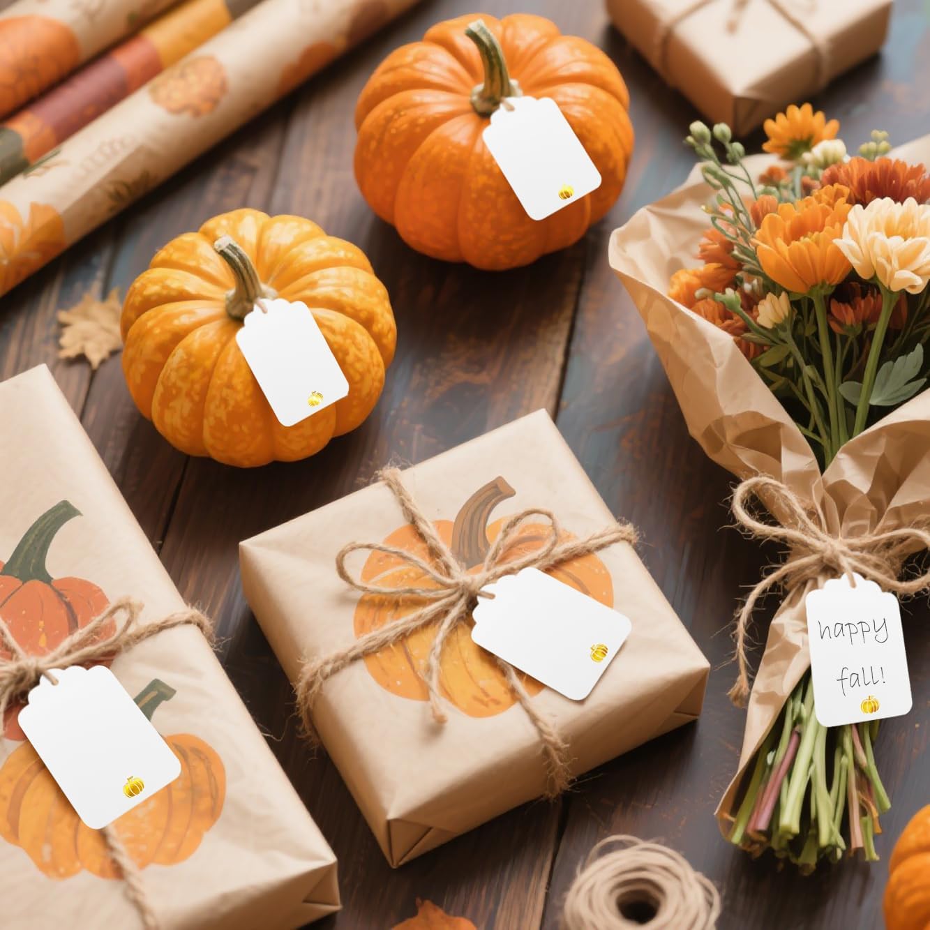100 Pcs Blank Gift Tags with String Gold Foil Pumpkin Large White Paper Gift Tags with 65 Ft Jute Twine Cute Tags for Halloween Autumn Fall Harvest Thanksgiving Gift Wrap Tags