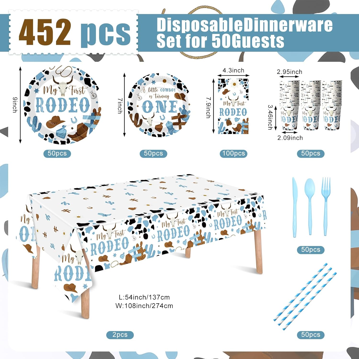 452 Pcs First Rodeo Decorations Boy, Blue Western Cowboy Paper Plates Napkins Cups Tablecloth Cutlery Straws for My 1st Rodeo Birthday Party Baby Shower Decorations Supplies for 50 Guests