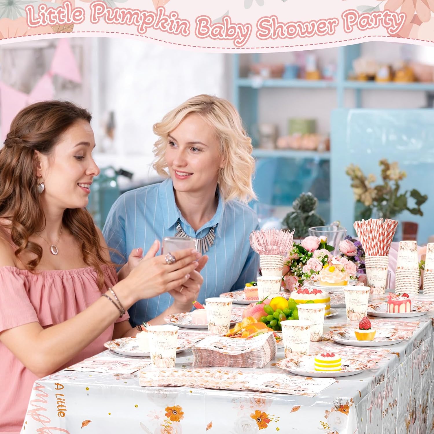 452 Pcs Little Pumpkin Baby Shower Decorations for 50, Pink A Little Pumpkin Is on the Way Paper Plates Napkins Cups Tablecloth Cutlery Straws for Autumn Fall Thanksgiving Party Supplies