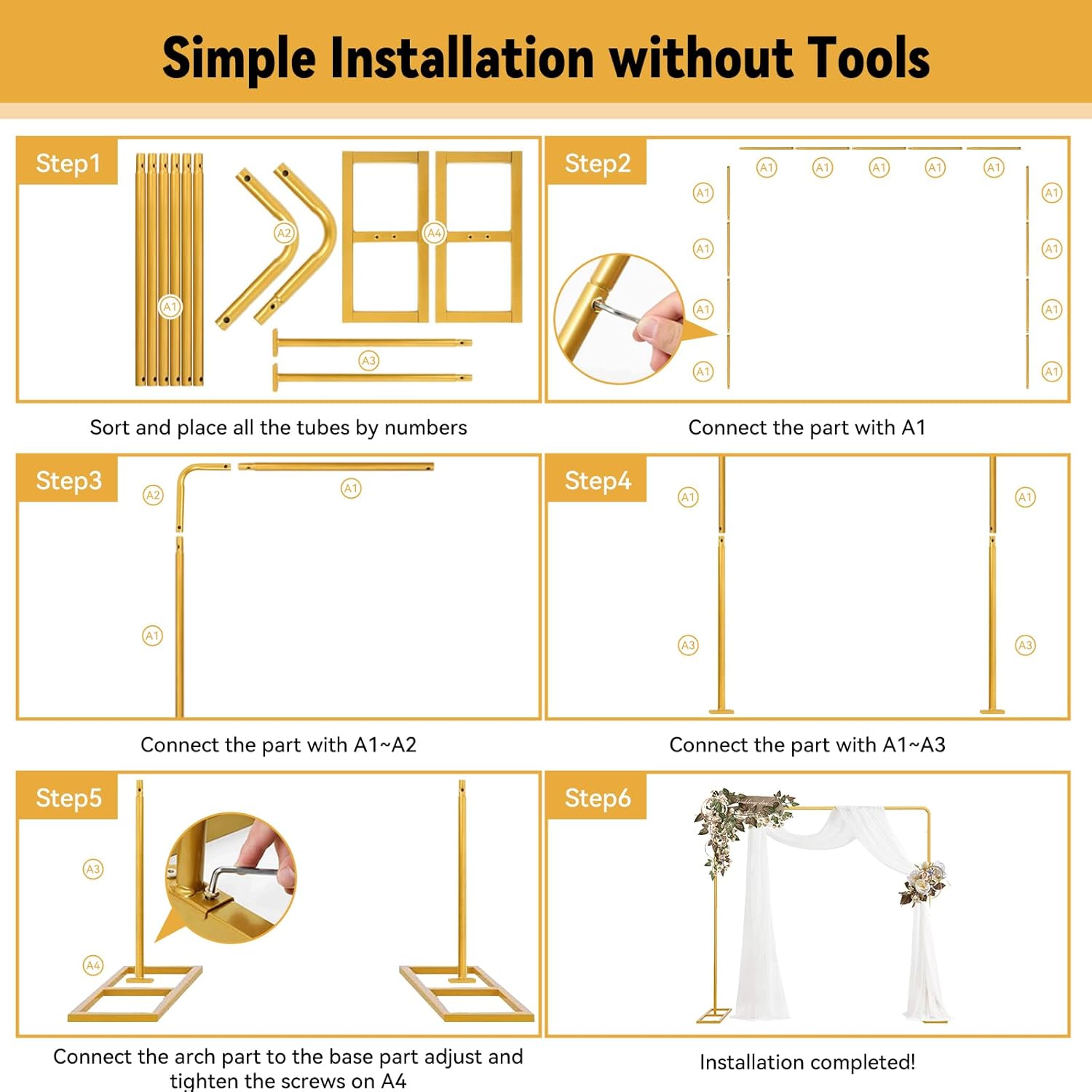 - Arch Backdrop Stand: Arched bracket for quick assembly and disassembly. Simply connect the thickened square steel tubes together and secure them with screws. Square wedding arch eatures with firm base legs, which is safe, secure, and provides a firm and balanced support