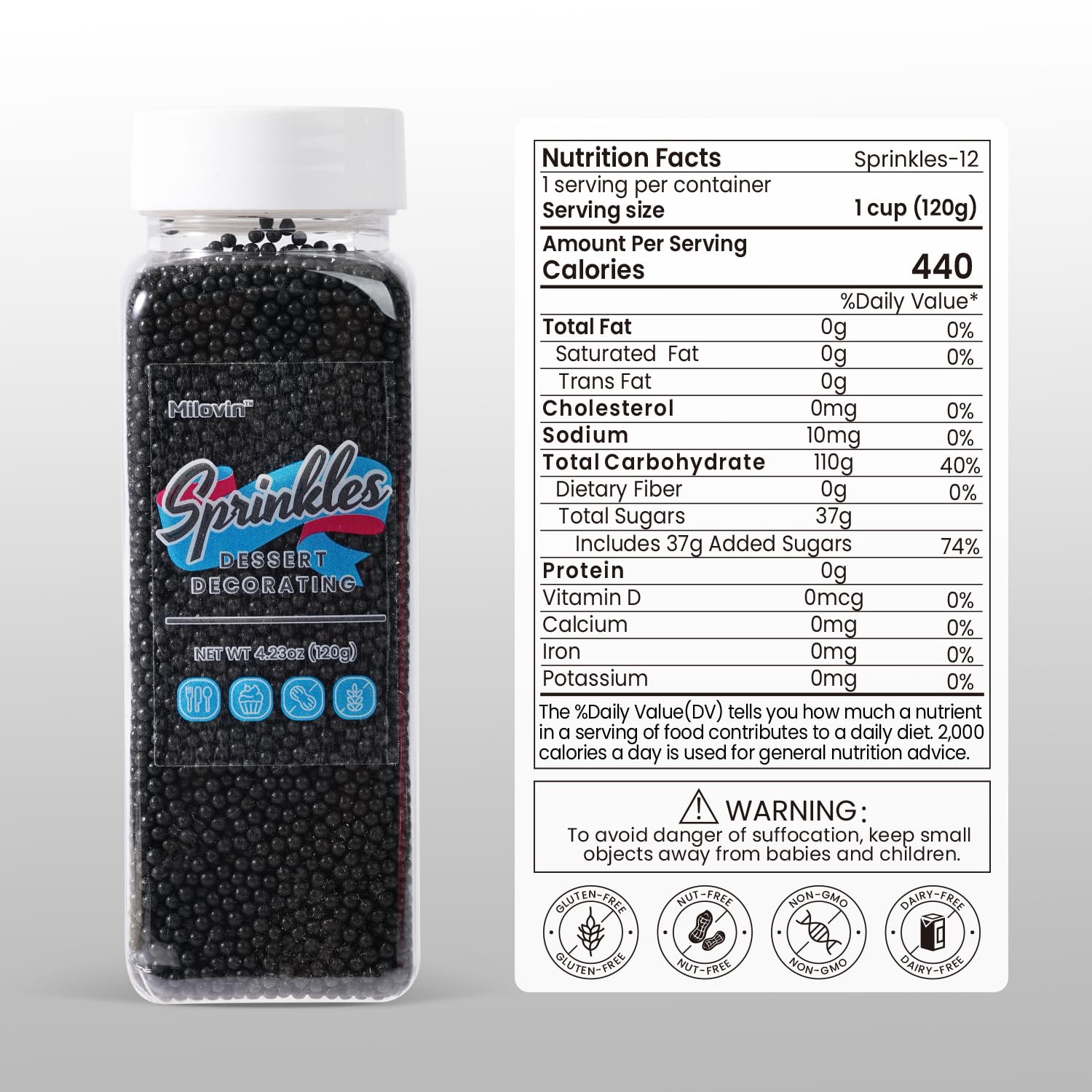 - Black Nonpareils Sprinkles: A bottle of edible nonpareils sprinkles(120g/4.23oz), whether it's cakes, cupcakes, cookies, ice cream, cake pops, brownies, or any dessert you can dream of; our black sprinkles are your go-to for that extra dash