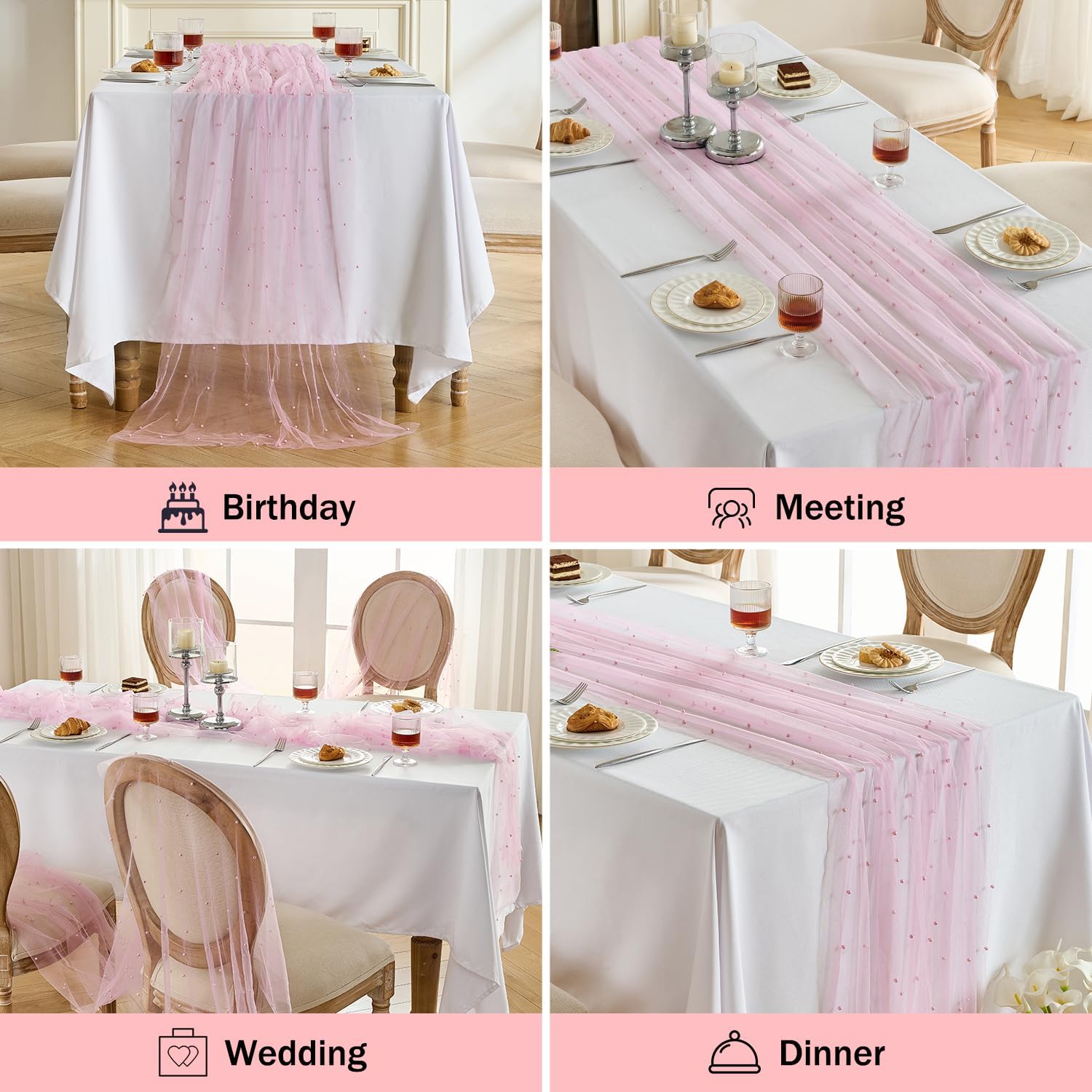 - Premium Material: Blush pink table runners made of excellent quality tulle fabric and smooth pearls, feel lightweight, touch softly, persistent and durable. Shiny pearls design, make sheer table runner more graceful than other blush pink table runner