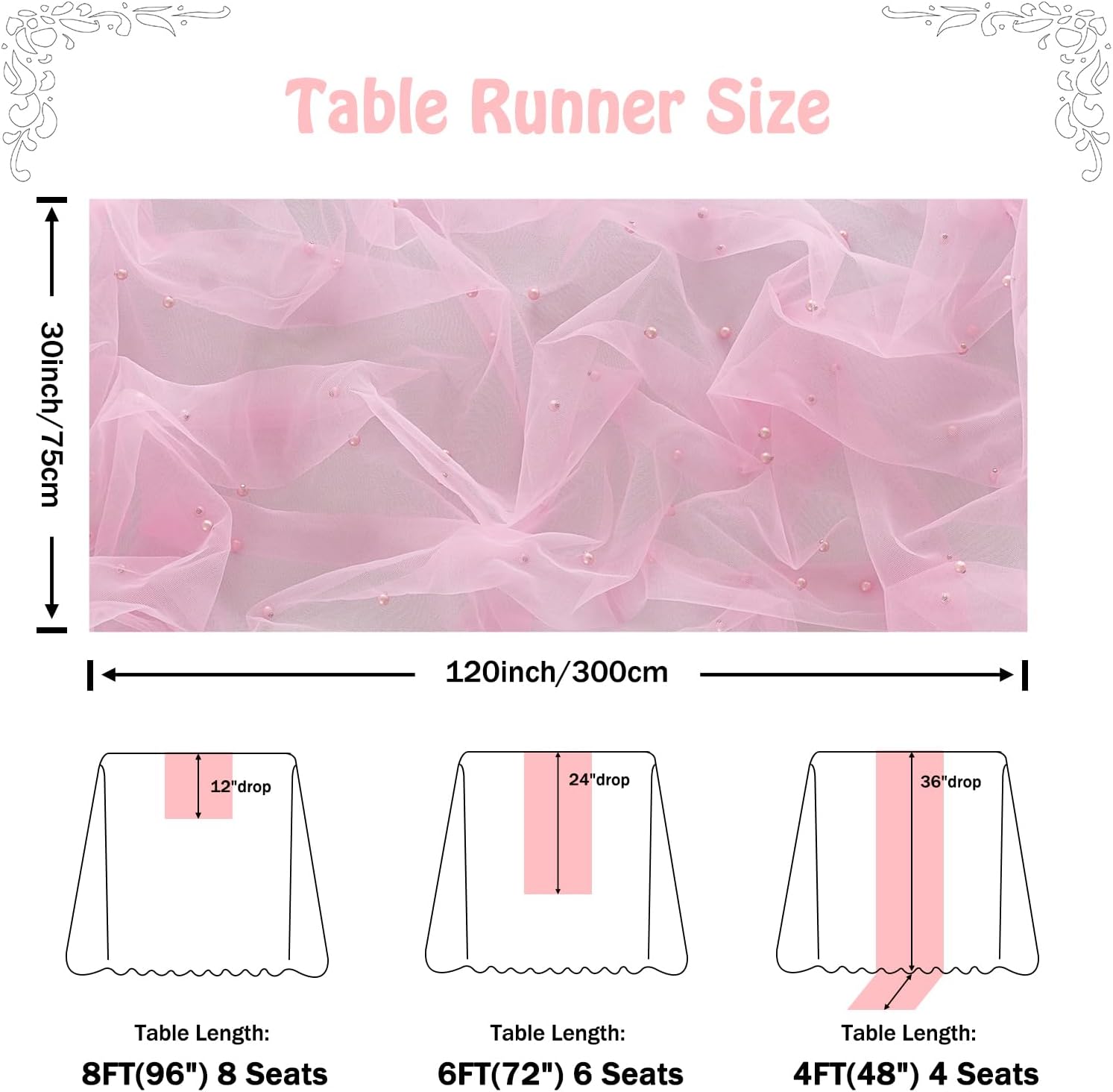 - Package Include: You will get 3 pieces 10ft blush pink pearl table runner. Each pearl tulle table runner measures about 30 x 120 inches, which is an ideal size to dress up most rectangle and round tables, can also be joined together for long table decor